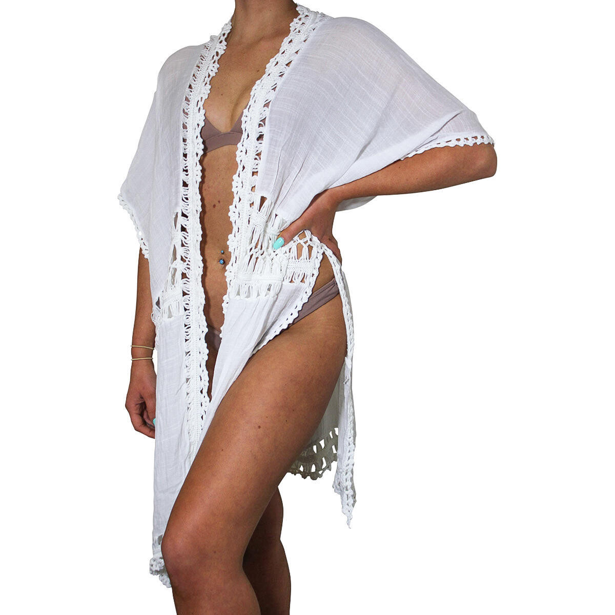 While you may have gone after that super stylish bikini you might have been eyeing for your beach look-or have been slaving after a super fit bod-do remember to grab that all important accessory that you need to reach for every now and then -a sarong wrap in white that suits all kinds of swim wear and the kind that will be lightweight and yet protection enough. This one has been created from very fine quality cotton and polyester with lacy midriff panel and high slits on the sides allowing you a lovely casual look. The wrap ahs one tie up in front and a wide lacy trim in the front panel adding to its great looking finish. It's about knee length and demure yet covers enough in the most stylish of ways. The loose unstructured sleeves end at the elbow and is created much like a kaftan.