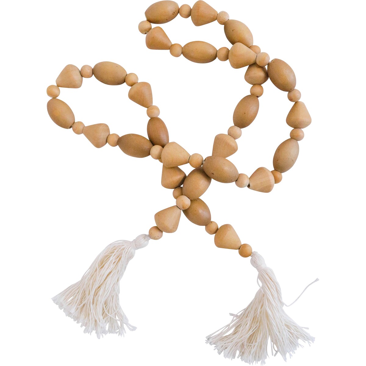 We’ve always loved how wooden bead garlands with tassels add a bit of coastal character to almost any setting. This one measures roughly 120cm and is made from beautiful birch wood, so it’s got that lovely light finish - customers can use it on tablescapes, shelving, in baskets, or even on the wall. It’s neutral but never boring - and these tactile shapes are really good for adding contrast to softer throws or ceramics in home styling displays.