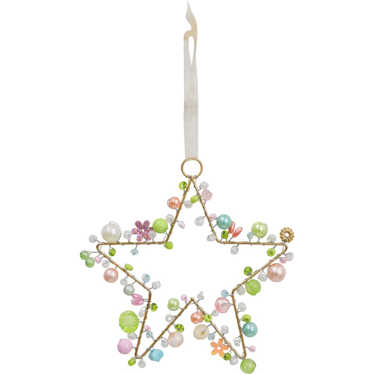 We love the Beaded Star Blossom - it has become one of our top choices for homewares and giftware retailers. The 10x.5x10cm ornament really stands out, especially because of its handcrafted nature. That means each one will be slightly different in size and shape, which is actually a part of its beauty. Made from wire, glass, plastic, pearls, and ribbon in delicate pastel colours, it has a soft and inviting charm that draws the eye.