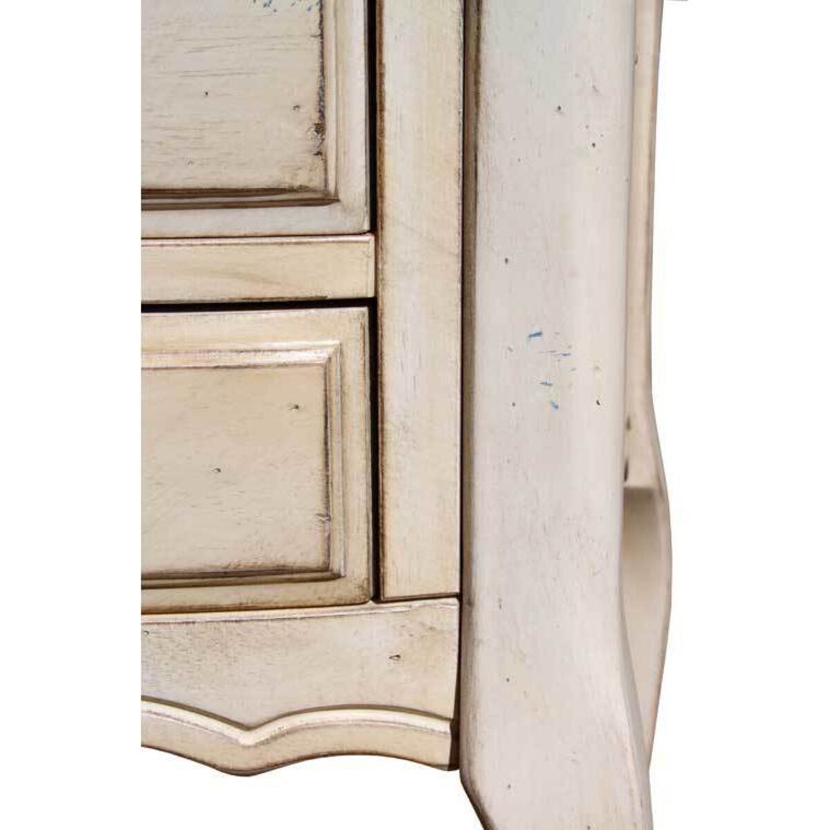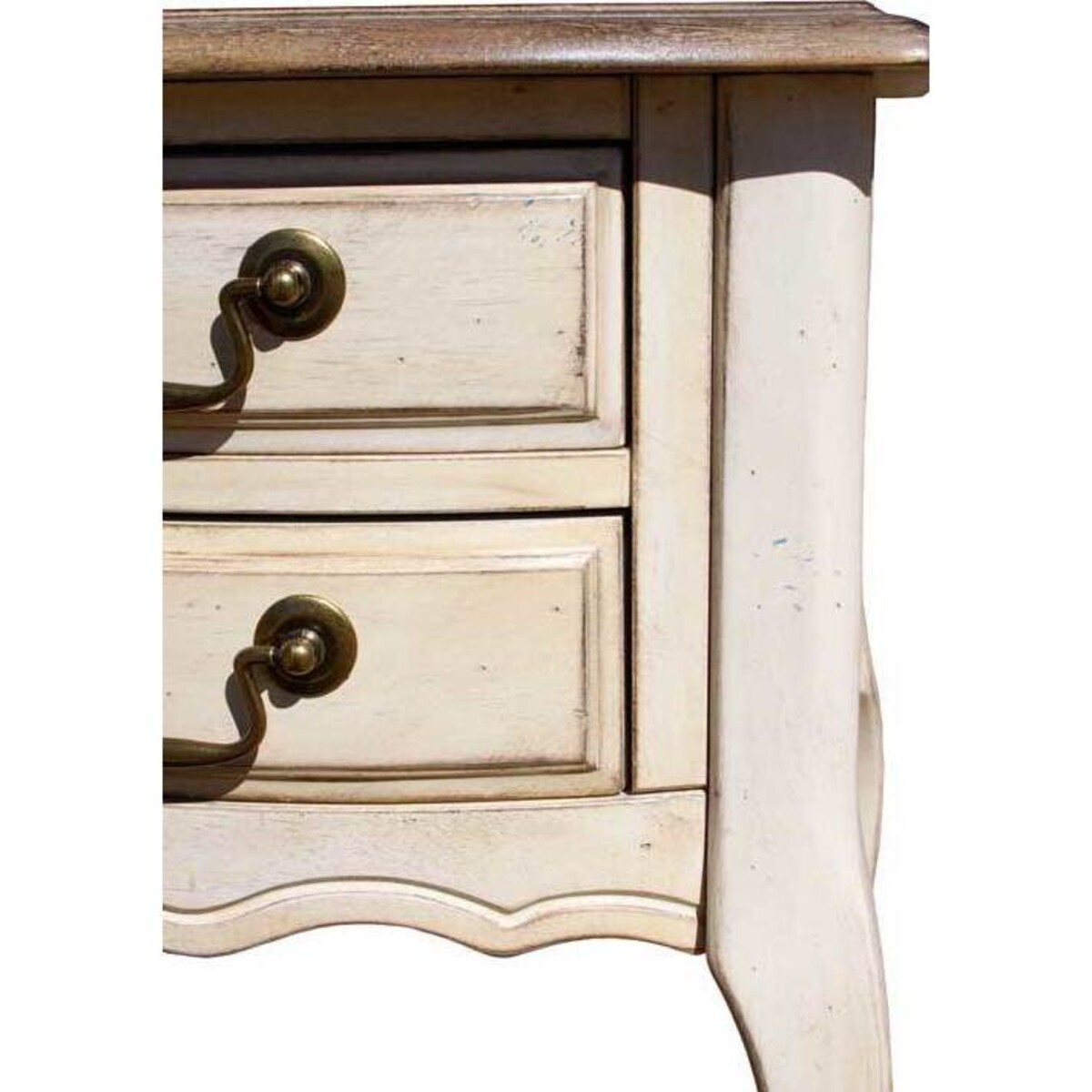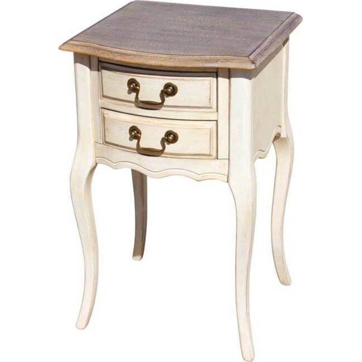 The beautiful Latina 2 Drawer Bedside is made of solid wood. It has an aged painted body and legs with a wooden top. There are marks on the painted finish to suggest wear and tear to give a vintage feel to the piece.