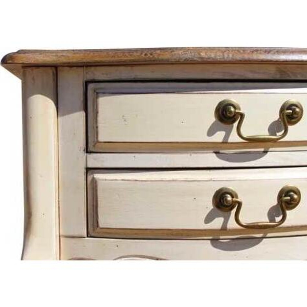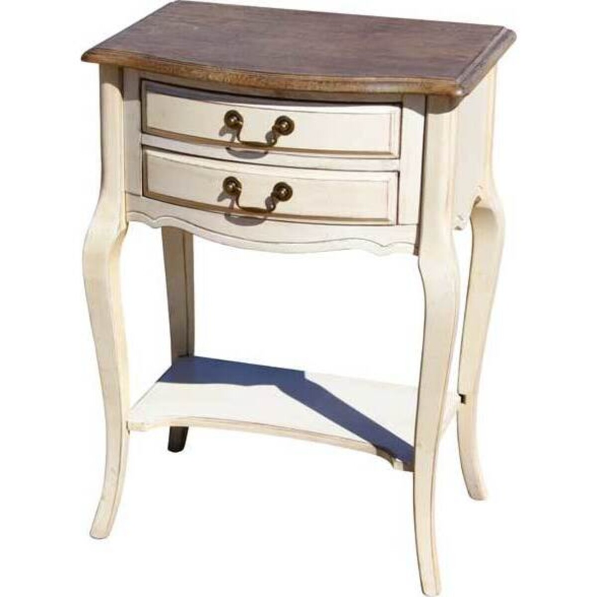 The beautiful Latina Bedside with Shelf is made of solid wood. It has an aged painted body and legs with a wooden top. There are marks on the painted finish to suggest wear and tear to give a vintage feel to the piece.