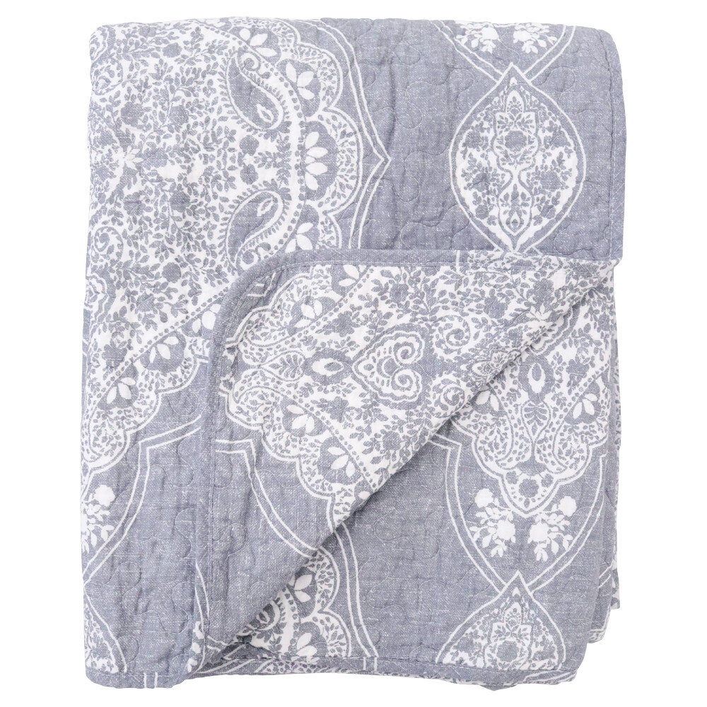 Right - the Bedspread Lrg Vintage. This is one of those pieces that just sort of brings a whole room together, you know? The vintage pattern really stands out, but it’s not loud. It’s a softer touch - classic and detailed. And the size is massive at 200 x 230 centimetres, so it’s perfect for double and queen beds. We love having a bedspread like this in our line-up. Retailers seem to gravitate towards it because, well, it works for a lot of customers. Some are going for the classic cottage look and others just want something with more personality than plain white bedding. The outer layer is cotton which gives it that nice soft feel, and then there’s the lightweight polyester filling inside which makes this warm but still manageable even on warmer nights. It’s ideal for all seasons actually - not too heavy but not light as air either. We think it sits pretty comfortably across most homeware categories. It’s versatile, stylish and maybe even a little bit fun to style with some nice neutral throws or cushions. We find that this works in almost any home.