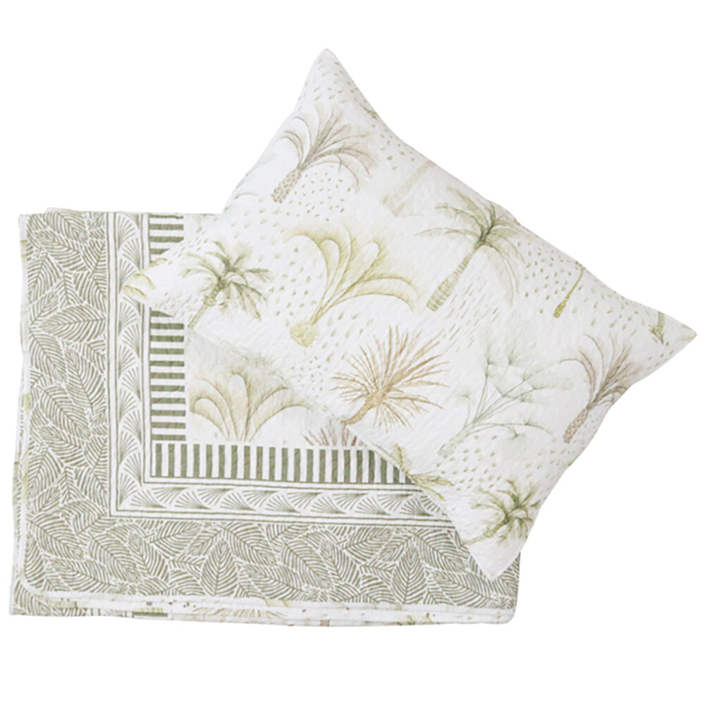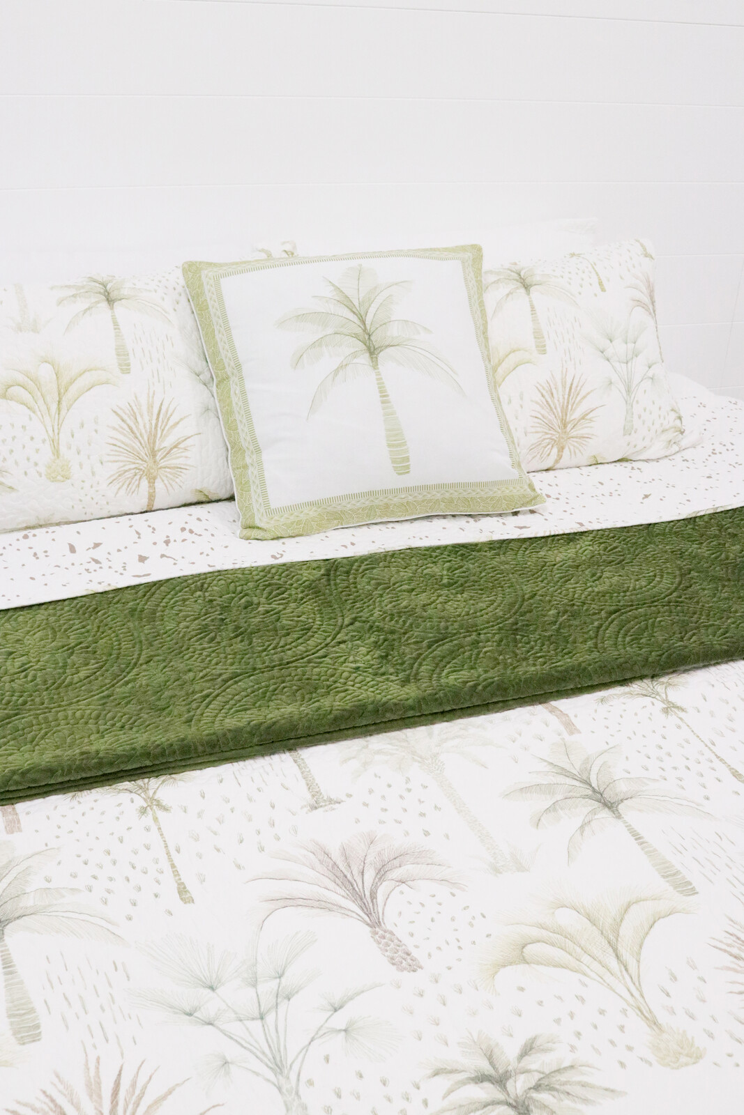 Light tropical and softly patterned, there’s something very understated about the Bedspread Set Palmier. This set works really well for those who are moving from neutral palettes to experimenting with foliage or, say, florals. We find that even if you’ve never incorporated shades of green before, this set just works - the muted, natural greens blend really nicely with beige, tan, stone, and even soft marbles. And it definitely keeps a clean finish overall because the off-white is still very much the base and main feature here.