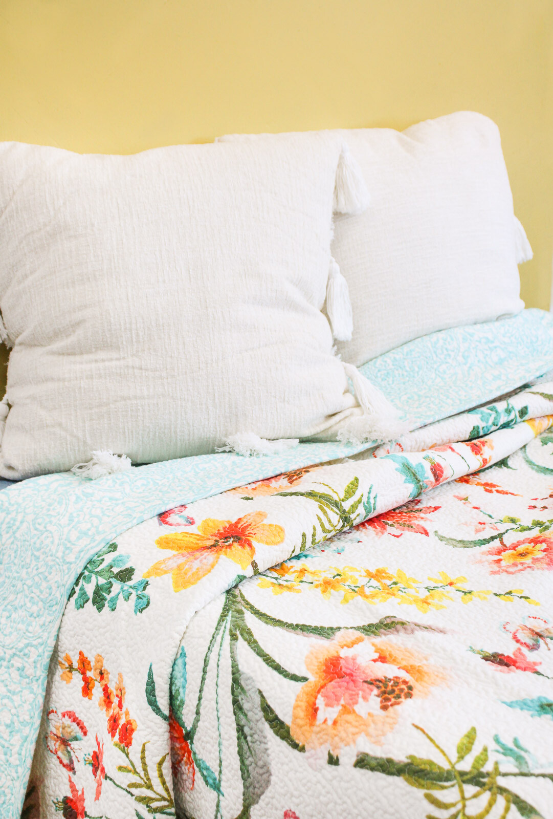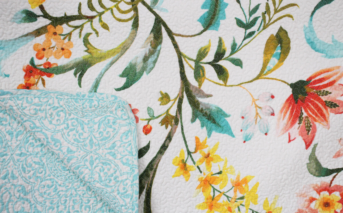 Go easy on your bed by spreading this lovely floral bedspread. Featuring sweet bright pink, coral, yellow and green tones of flowers that give a fresh vibe to one's bed and initiate a relaxing nap. Lie on the coziest and loveliest sheet to enjoy sweet dreams.