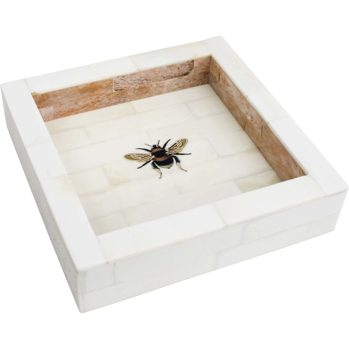 We've seen quite a few trays before, but there's something about our Bee Tray that really gets people talking. Right off the bat, it's the hand-inlaid bee motif - small, detailed, and elegant. Customers can't resist picking it up for a closer look. This piece brings just the right touch of whimsy without being over the top. Its crisp geometric lines are softened by the warmth of bone inlay - it's got a nice weight to it and feels very solid in-hand.