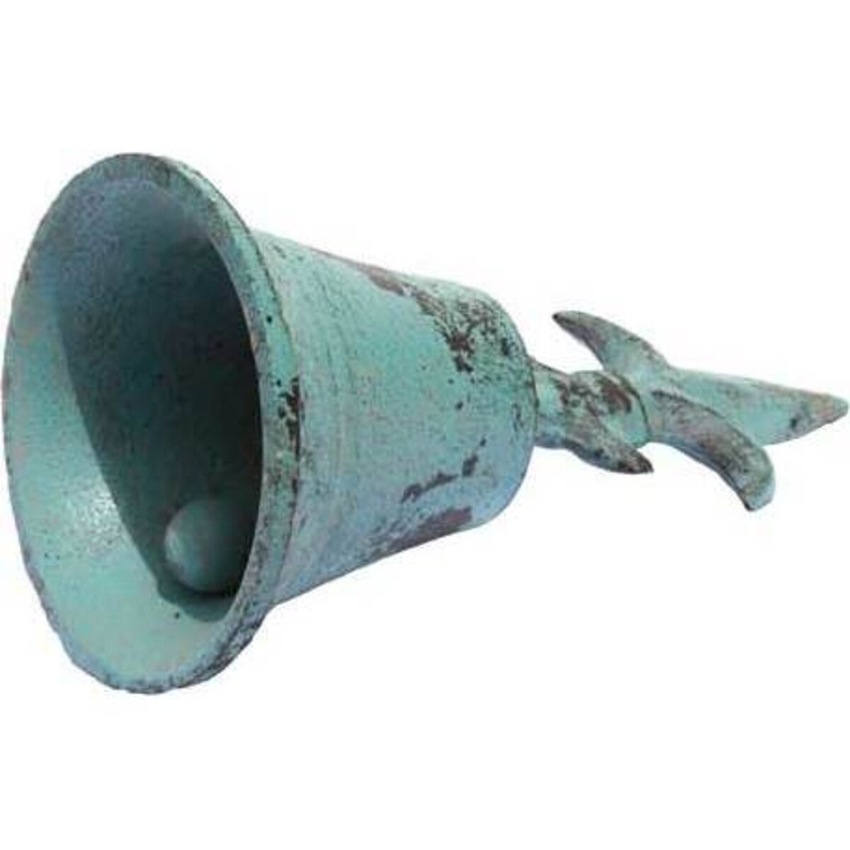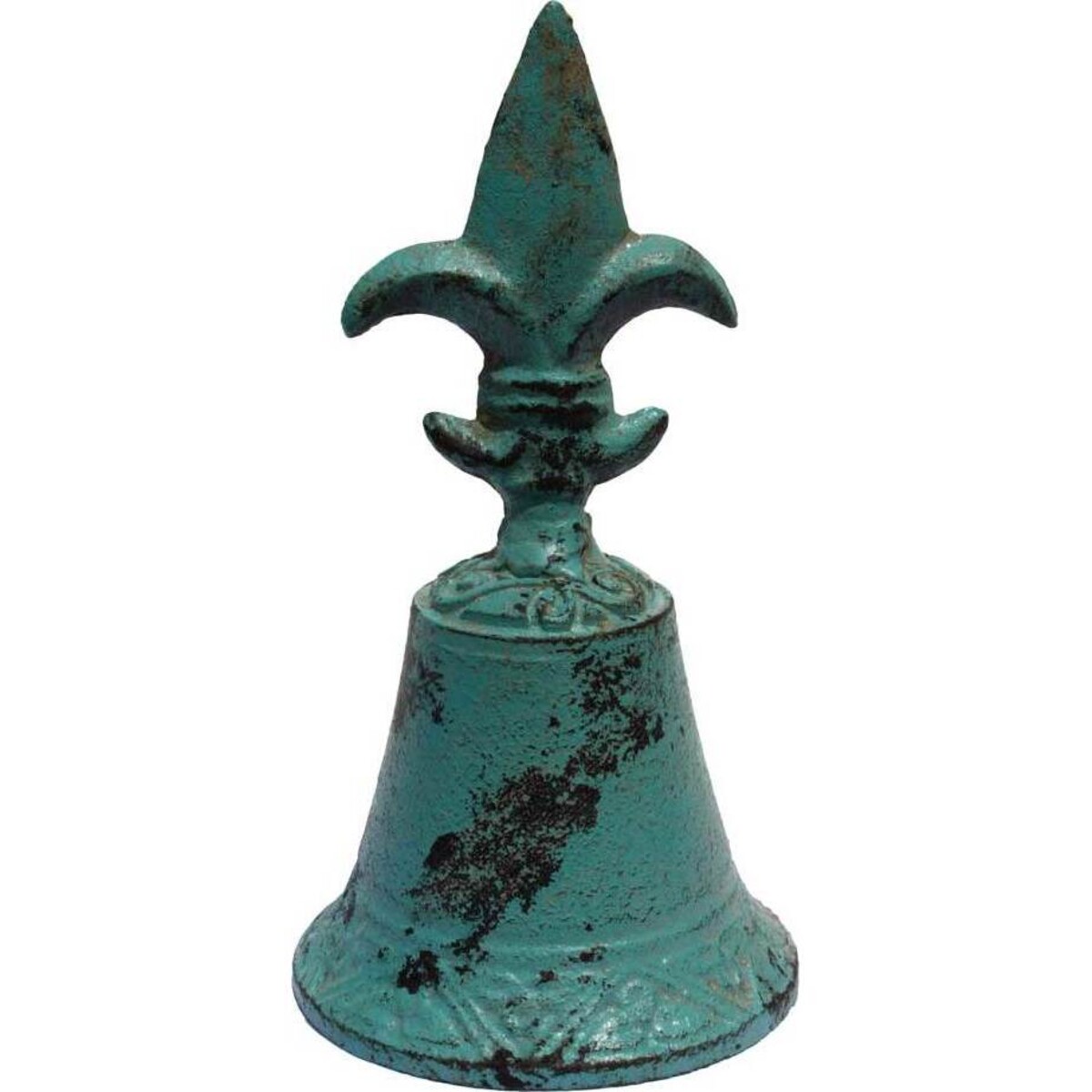 Introducing the Fleur de Lys Bell, a decorative accent that looks more like an antique work of art than something made in modern times. The teal metal bell is carefully worn down to give it an antique weathered feel and has a large Fleur de Lys on the top as the handle with elegant carved detailing at the neck and on the base. Everyone will think you spent a fortune to get it from an antique shop, but we know the truth. You don't have to pay a fortune for excellent style.