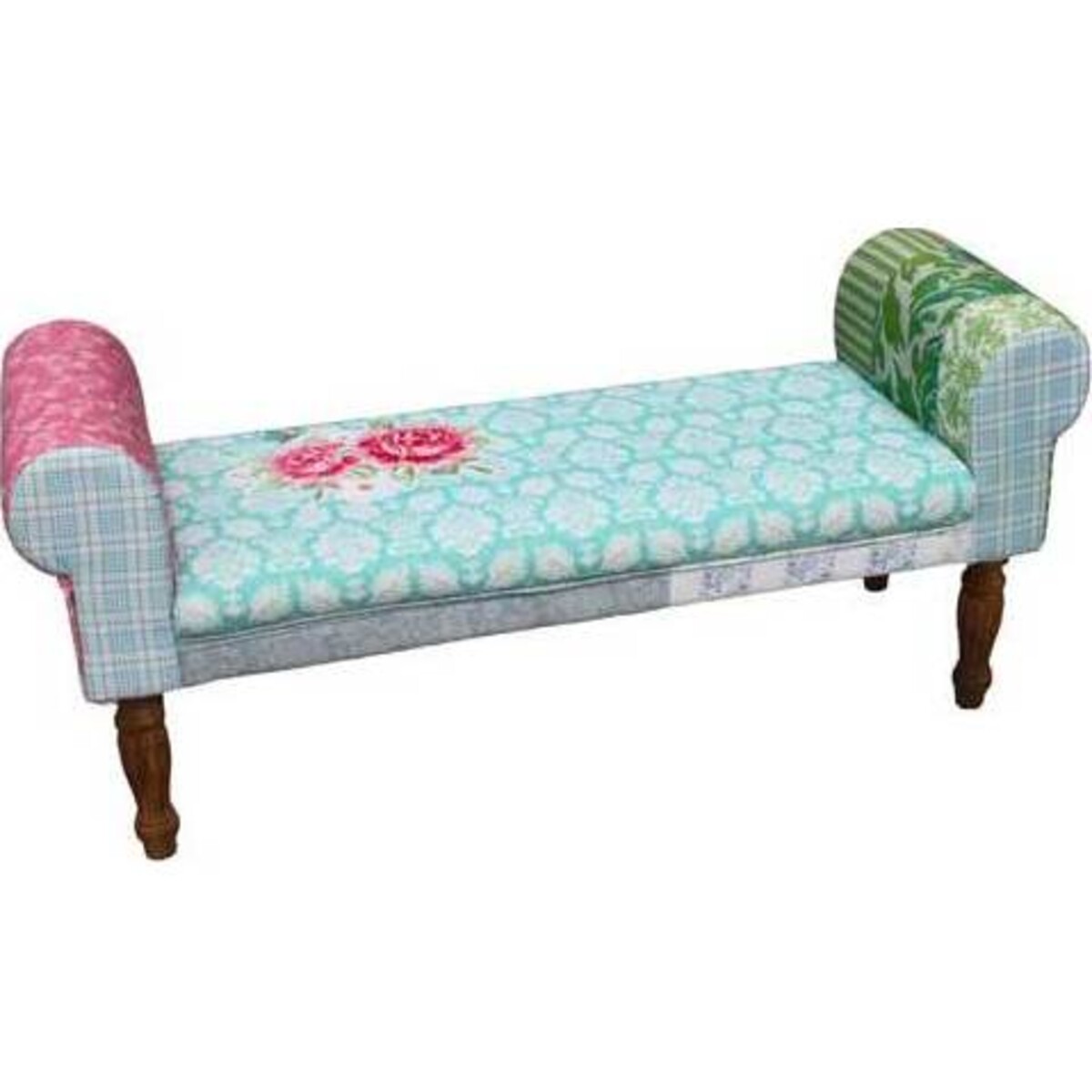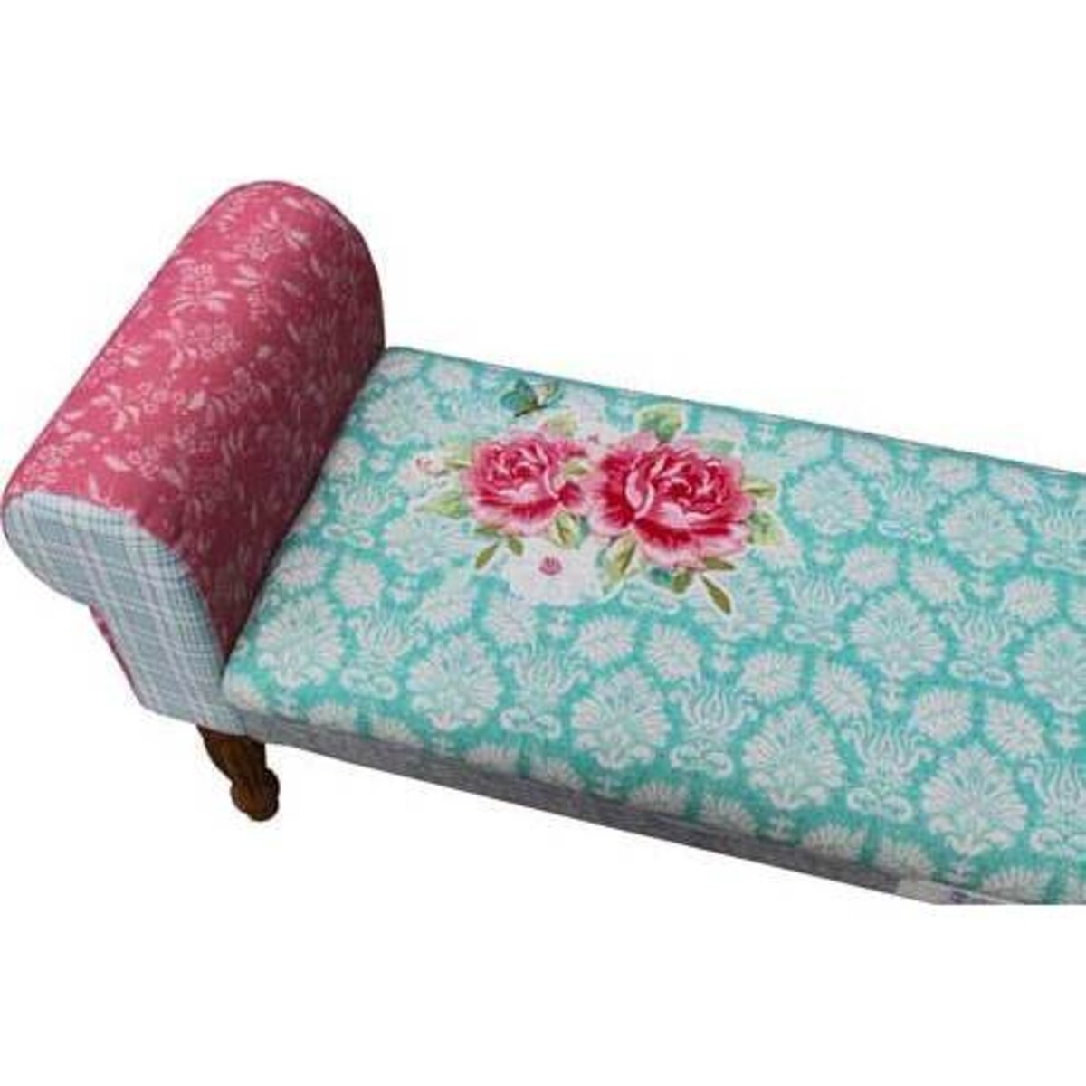 This exquisite bench features carved cushioned armrests, four solid brown wood legs, and the Pi?e de r?istance is the fabric on the bench that consists of multiple colours and patterns including blue and white damask with large pink roses on top as well as blue plaid on one armrest. All of the fabrics are patched together in beautiful fashion to make one lovely piece. Put it in the foyer, at the foot of the bed, or in the living room and it's sure to brighten up any room.