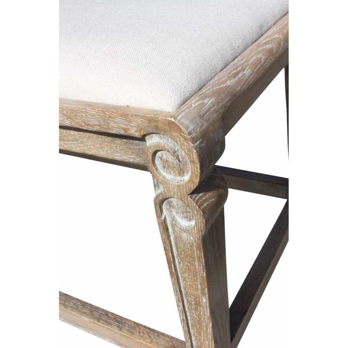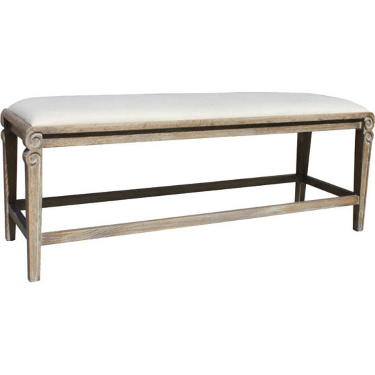 It has a very plain apron, made extra resilient with the addition of the stretcher a few inches off the ground. The bench's legs are straight, quite plain. However, the manufacturers have added a great accent on the upper part of the legs, near the apron. These are the round, scrolled carvings, very similar to the detailing in ancient Grecian furniture pieces. It also features a wide, soft seat, upholstered in a light cream fabric.
