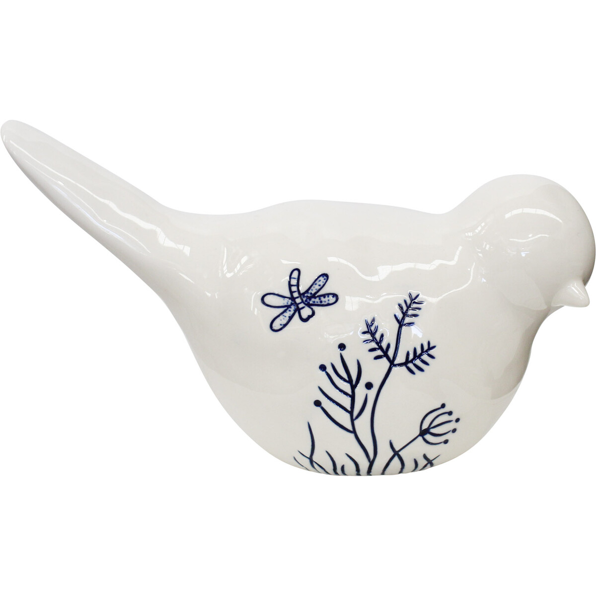 Ornately moulded in a portable sized dimension which measures 15.5 centimetres in length, the Bird Frenchie Lrg equally has a width which measures 8 centimetres and height measuring 12.5 centimetres in length. Elaborately moulded in the figurine of a portable cute bird through the use of premium quality porcelain material, it is then hand finished in a pristine white finish which is further ornamented with floral patterns and the image of an insect using appealing bright navy shade of blue hue. Each is unique in hand finished design.