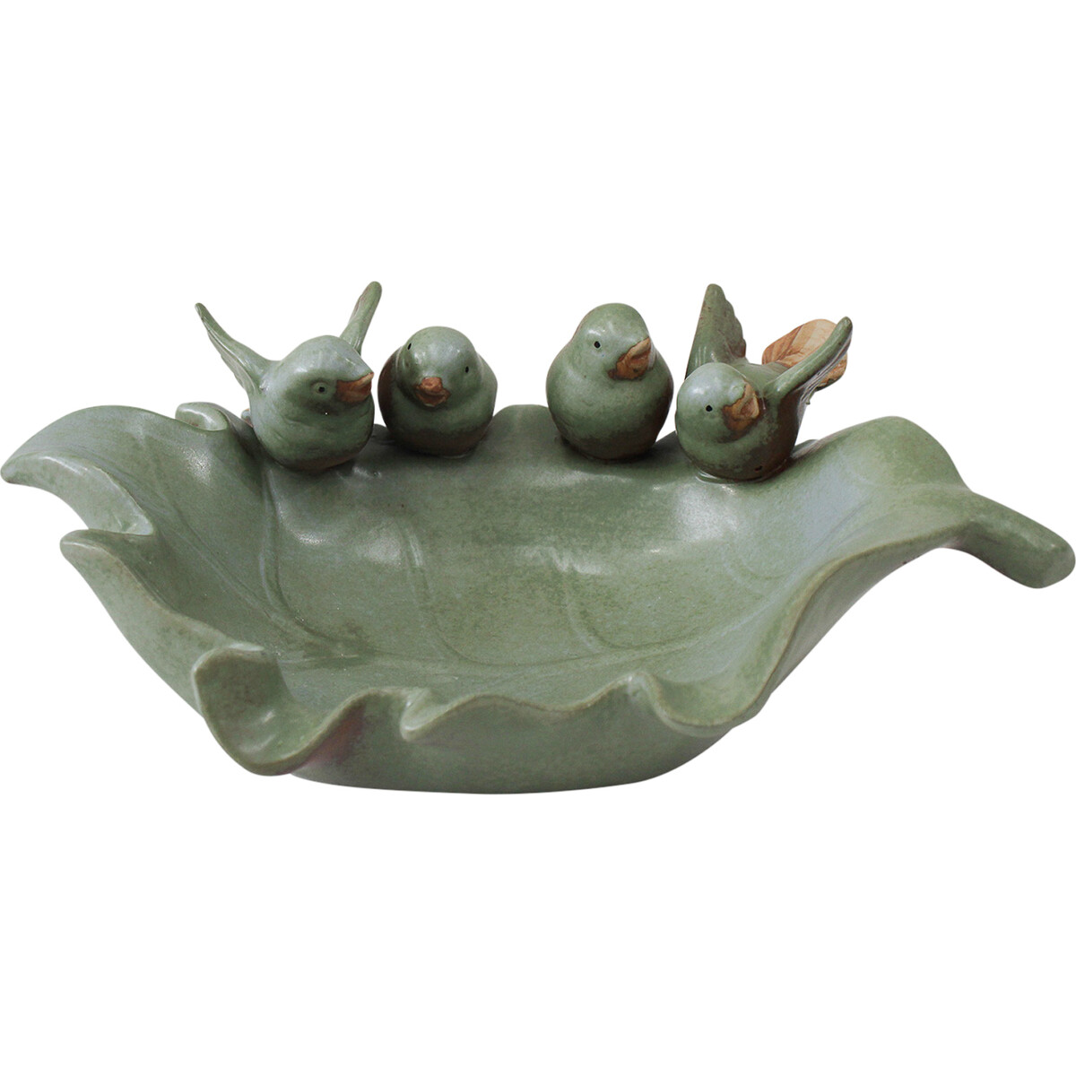 Grandiose and rare ornaments such as this Bird Leaf Misty are a quick sell and a means to retain new customers while also keeping your long term customers happy as they keep coming back for more. This exquisitely moulded ceramic ornament is shaped in the form of a big leaf with a hollow middle while four lovely birds are perched in a row at the edge of the leaf in a manner that looks like they are at the pool to drink water.
