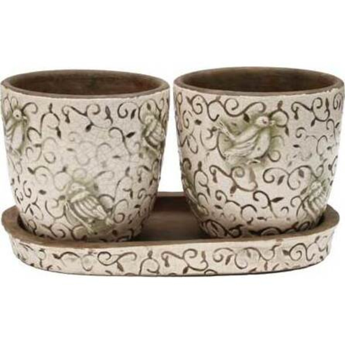 This Pair of Bird Swirl Pots is just what you've been desiring. The set features two small pots, each of which is stone-coloured on the inside and cream-coloured on the outside with a brown swirl and bird design. The best part is that they come with a matching tray, so you can keep them right next to each other and carry them from one place to the other with ease when necessary. Whether you put them indoors or out, you'll simply adore displaying these pots at your home.