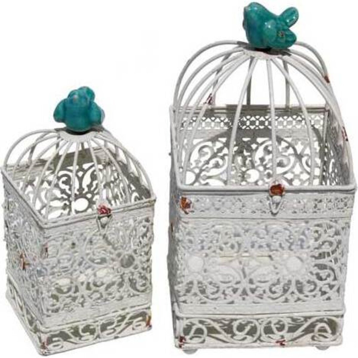 Become the talk of the town with this one of a kind birdcage that features an antique design and a vintage feel. When placed on a dark - coloured surface, the painted white birdcage catches the eye of anybody who comes across it. The spiraled pattern of the birdcage boasts a vintage feel while the rust - coloured bits make it look and feel like an antique. As if that wasn't enough, there is a bright turquoise bird on the top of the cage that really pops against the white coils. Perfect for the dining room or living room, the blue bird birdcage is ideal for anyone looking to add a little "umph" to his or her home.