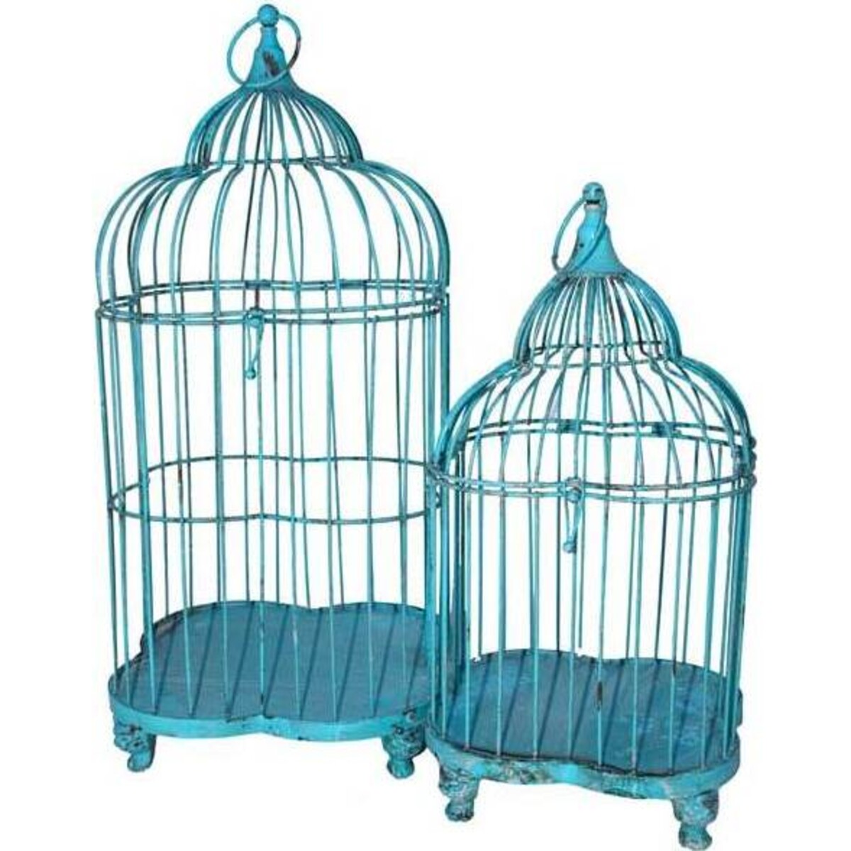Each birdcage in the set is a different size ? one large and one small ? but both consist of a lovely blue colour and and a charming multi-tiered design that can incorporate well into almost any room. There's a loop at the top of each one to allow for easy hanging or transporting from one location to the other. Whether you keep these birdcages in your home or place them outside as part of your garden décor, you'll love having their vibrancy around your home on a daily basis.