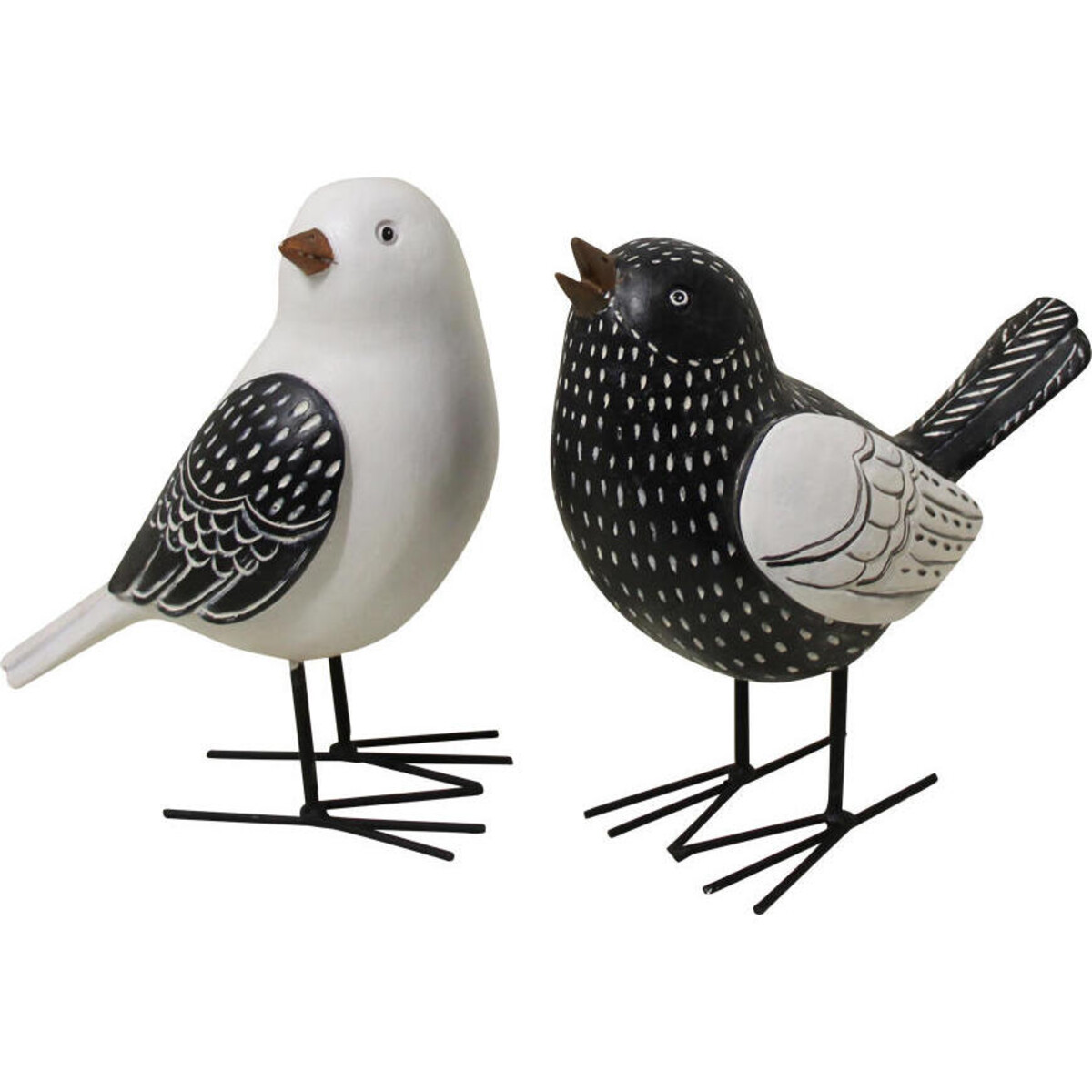 Delight your corners, table tops or shelves with the presence of little creatures that come to you bringing the inimitable farm and cottage charm that you wish to build into your décor. Made from resin and designed to impact as much with their small size as with the little details. You will instantly connect the pace with to things fresh, innocent, natural and very rural. This pair of birds in black and white could be placed near lamps and such places where the light could catch their subtle patterns. The posture, the wings, the manner in which the tail. The feet, eyes and beak are all so close to the details one could get on real birds.