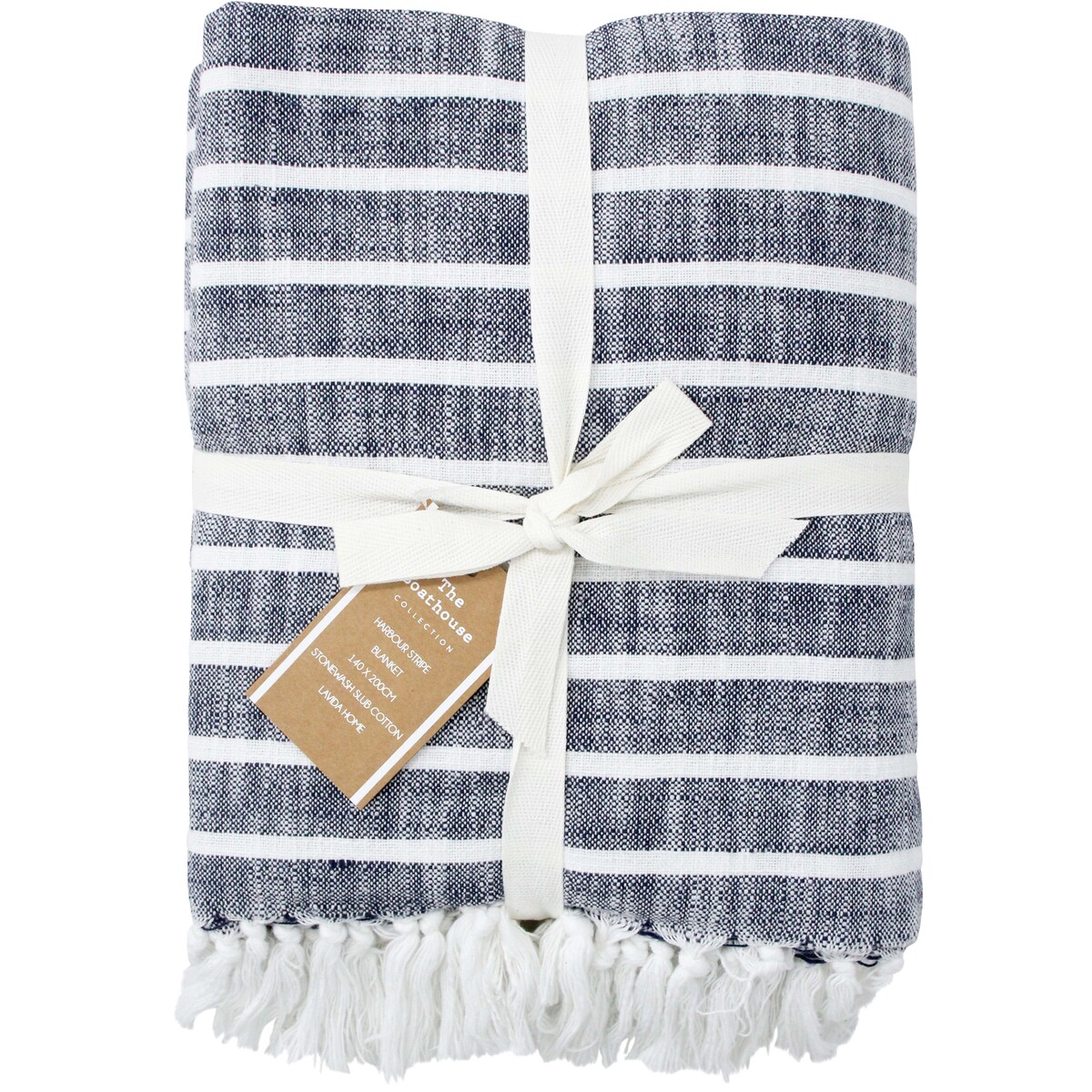 We think the Blanket Harbour Navy Chambray is an absolute classic, and it’s probably one of our most versatile pieces - 140x200 cm of rich, soft navy stonewashed cotton. The gentle, hand-feel finish? That’s because we use premium stonewashed cotton fibres that just get better with time. It’s incredibly soft yet still breathable, and the added thickness means this blanket is a go-to for customers who want to be genuinely warm in winter - but without feeling too weighed down on those in-between days either. We especially love that crisp navy stripe pattern, contrasted by all those hand-finished frayed tassels at each end. It manages to look like a designer find yet really does work with everything - suits a coastal, farmhouse or minimalist home without trying too hard. Not too plain, not too bold. Because it folds up so neatly, this style is a favourite for the sofa, bed or just as an easy picnic blanket for impromptu outdoor afternoons. And if you’re new to our range - you’ll discover this one pairs well with just about everything else we do at Rogue Homewares.