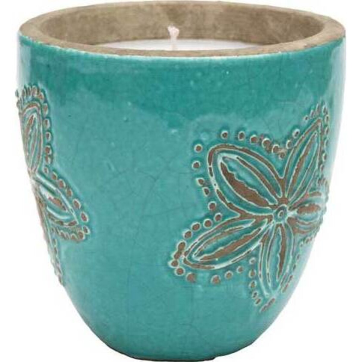 This Blue Flower Candlepot from Lavida is just what you've been searching for. The stone coloured inside holds a white candle while the outside is a vibrant blue with a matching stone coloured floral design all the way around. Whether you use it indoors or outside, it's a beautiful piece that will add a bright burst of colour wherever you put it.