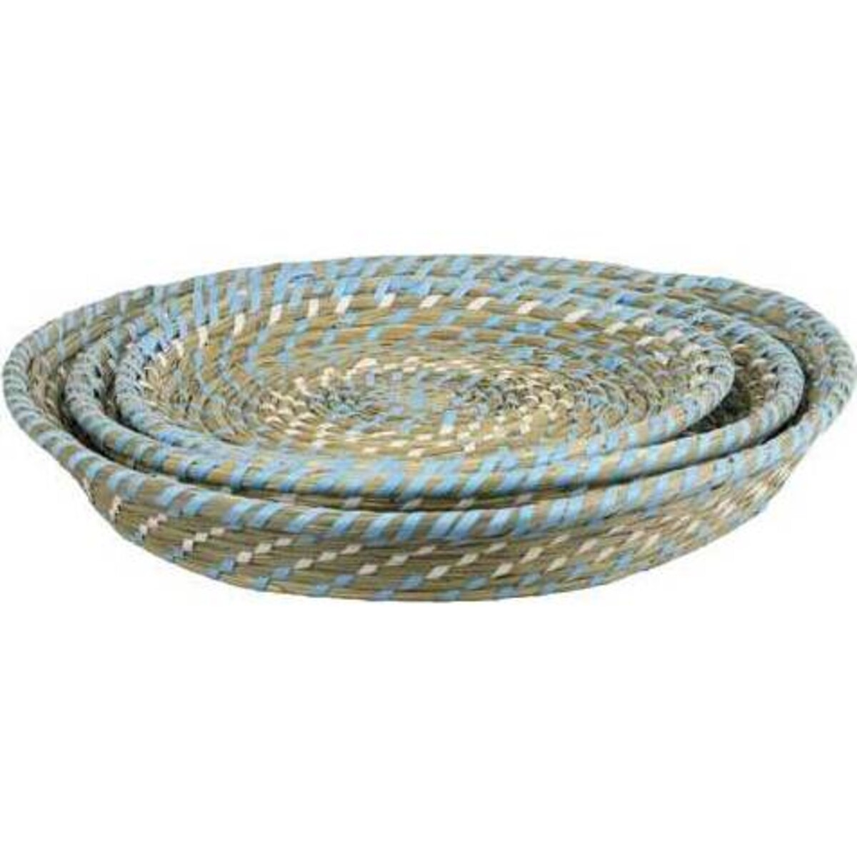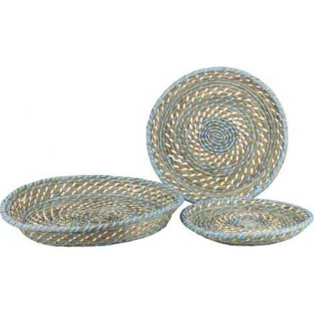 Place freshly sliced bread, scones, bread rolls or the fresh from the oven cookies - it will not just be the mouthwatering smell of the baking but the very look of them placed in these organic looking baskets that one's appetite will respond to. This set has three baskets with varying sizes, the largest having a diameter of 37 and the smallest with 21 making the large one suitable for placing fruits and for any other kind of display. Use them in the kitchen for keeping fresh cut herbs and vegetables, and make your kitchen counter feel more attractive, or use them on the dining table to serve fruits or breads - it is bound to get a lot of compliments both ways. Add the charming look of a simple sea grass design handmade basket set that works great as a tray set also. Can be washed and dried and reused. Easy maintenance and durability being its best features, it shall remain a strong favourite in your home for long.