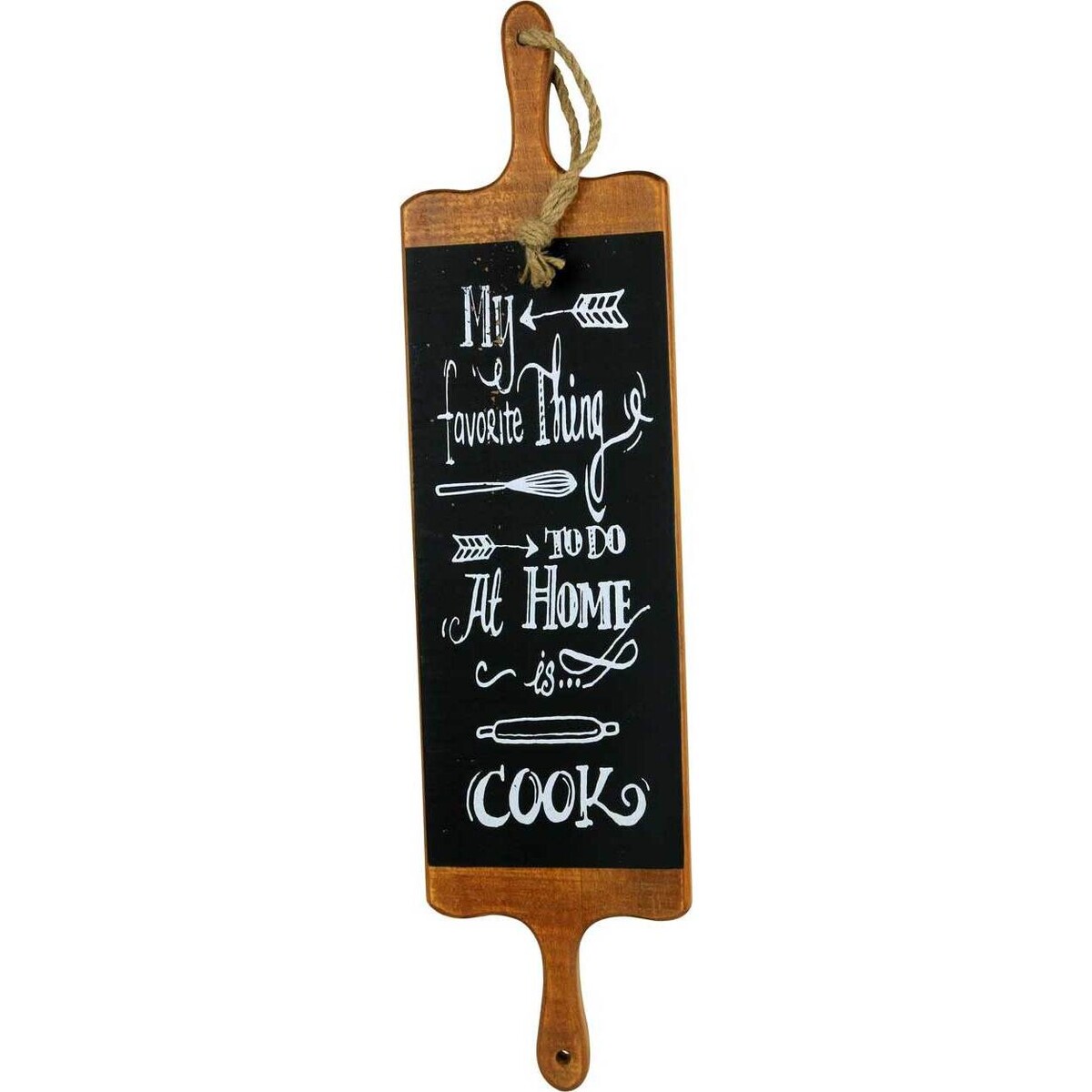 This object looks very similar to a chopping board, which adds to its essence of being 'all about cooking'. The message displayed is 'my favourite thing to do at home is cook', which makes it the perfect gift for anyone who loves cooking and loves food. The fonts on the sign are varied, which makes it interesting to look at and to read and will catch everyone's eye. When hung up in the kitchen, this sign will give your customers' kitchens a welcoming and friendly feel, as well as being motivation to make a good meal. As it is wooden and looks much like a chalkboard, it would look perfect in kitchens with a wooden look and is sure to be an item your customers will love.