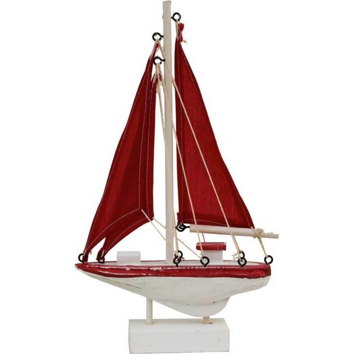 Boat Red Sail Small is a white wooden boat with a red stripe lining around the open top edges. A white pole supports two red sails placed opposite each other through white strings. The colourful mix and match used on this souvenir is easy to notice. A user can place this boat at a corner on stool - top or above the refrigerator or other prominent location indoors. Another innovative application is for children's demonstration classes where the young ones learn about wind and sea navigation. The boat craft measures 15x26x4cm, which makes it an ideal centrepiece for occupying a desirable place in the bedroom or other living space.