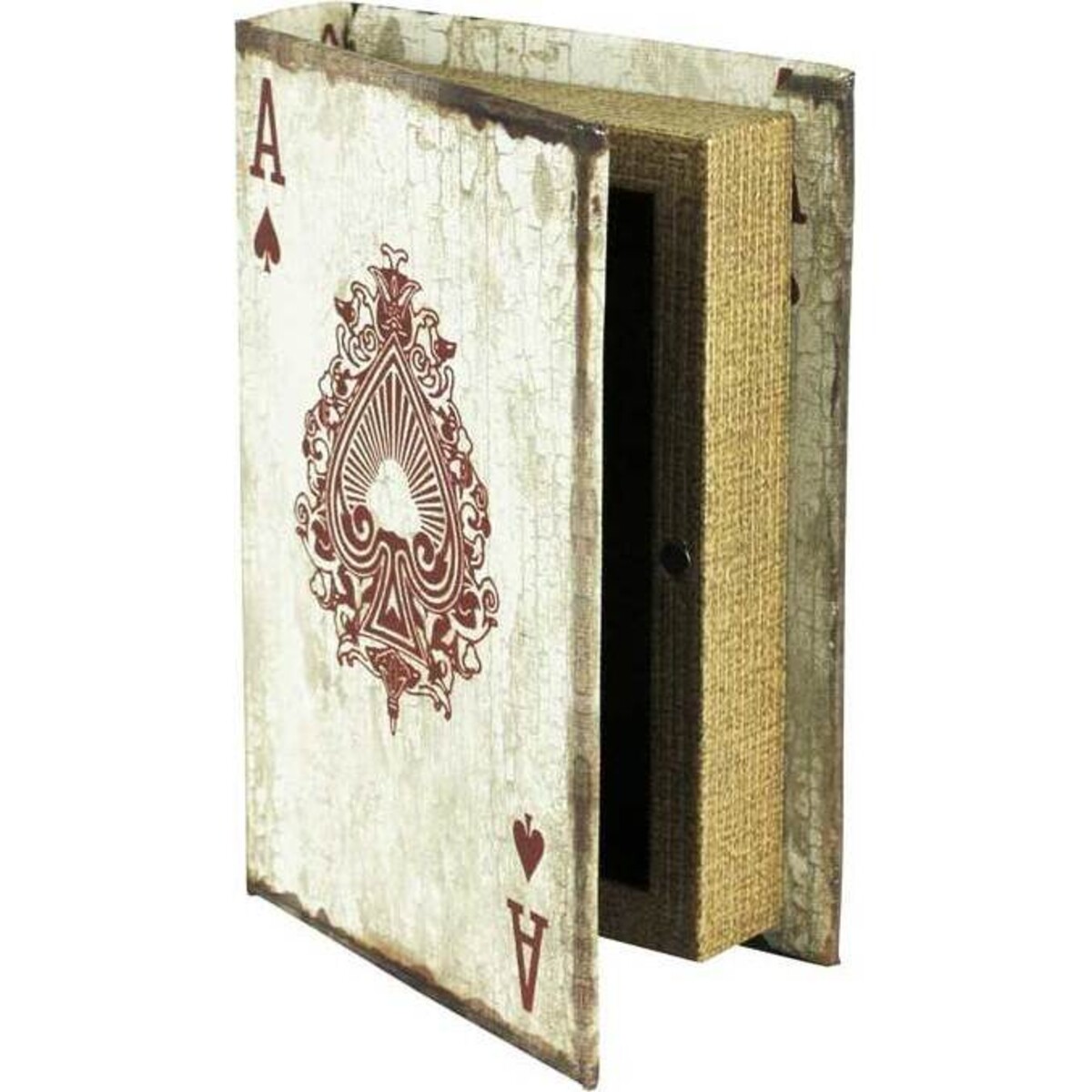 Fabricated from paper and cardboard this lightweight box has the ace of spades in it top and a rubbed paint effect al compartment on its edges making it look truly antiquated. The box has dimensions that would create quite a spacious compartment within-with a length of 14 cm, and width of 9 cm and a height of about 4 cms makes it medium sized trinket or keepsake box. The designing factor makes it a great buy from Lavida as it would be liked not just for its functionality but also it great looks. Would sit well on tabletops holding within things like buttons, curios, little keepsakes, and memorabilia that one holds close to heart. A great way to organize one's rooms keeping all those things well within reach .The vintage look of the box has been achieved rather immaculately. The box has a lid that sits well on the bottom frame and almost makes it look like a book.