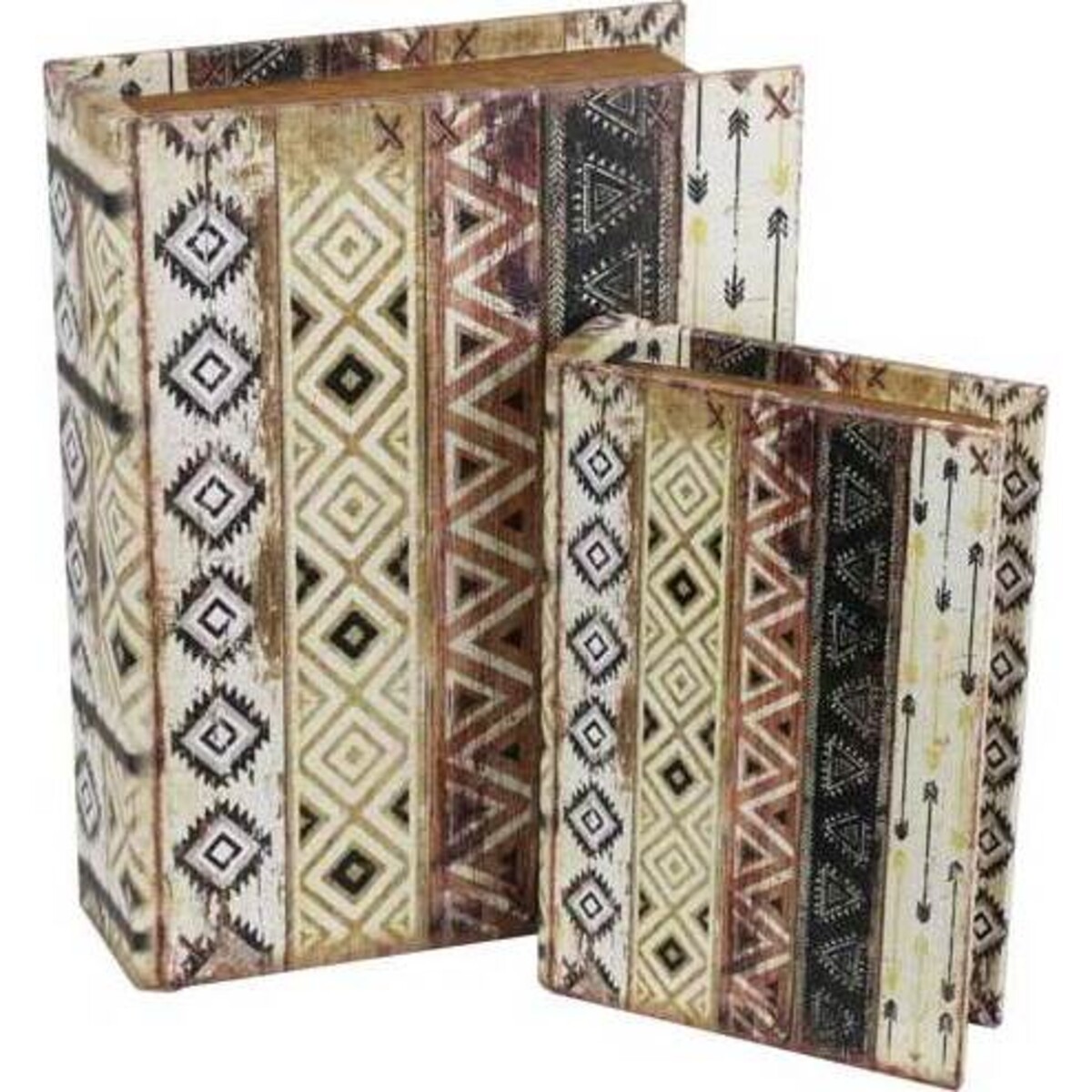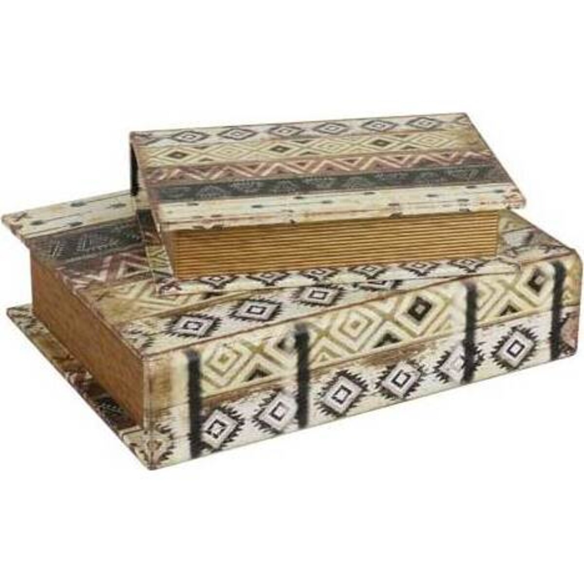 A gorgeous accent for your table that doubles up as a great organizer for all your tiny trinkets, collectibles and keepsakes - things that you wish to keep away from prying hands and fingers. The two book shaped boxes come with a spacious interiors most suited for strong while its shape and antique Aztec design will add so much to the décor as well.