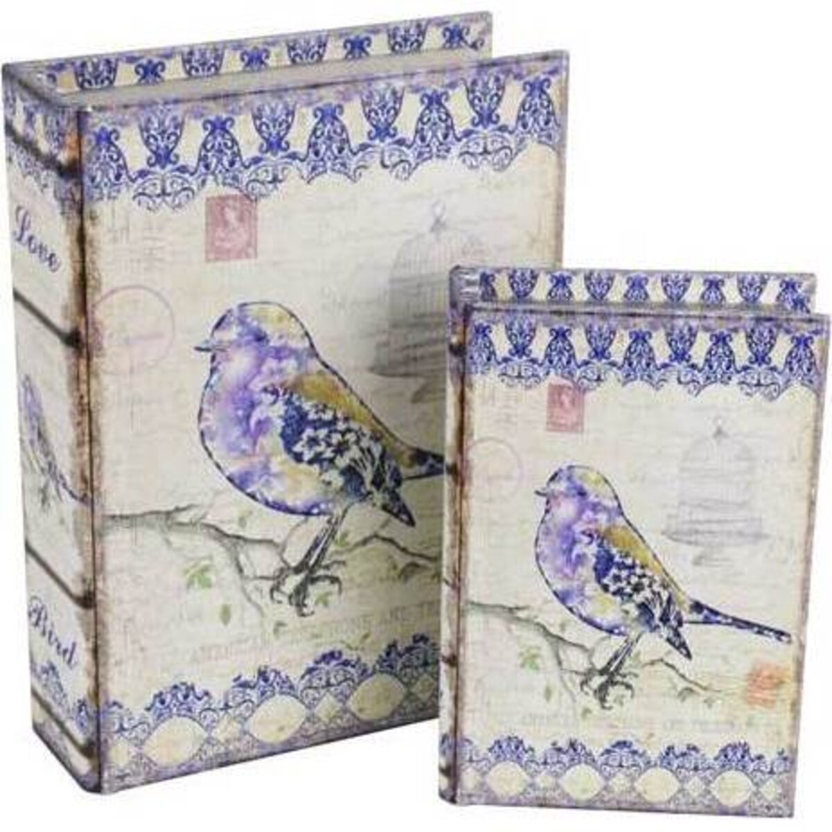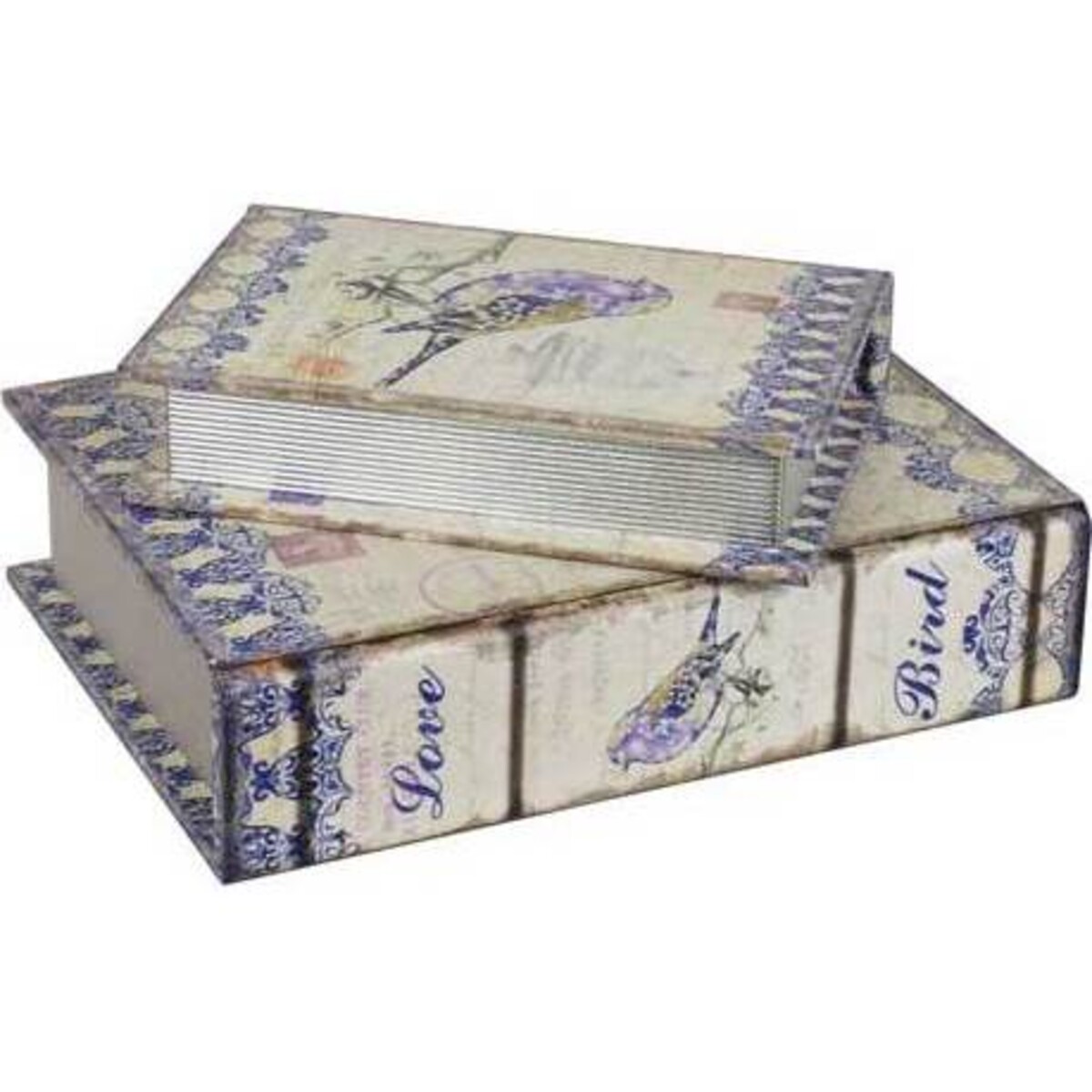 Storage boxes that comes in the shape of books has been lifted to quite another level of beauty in the case of this set of tow cases each of which has the most delicate of designs and a sturdy structure. The boxes have been fabricated mainly from wood and the cover with the help of dyed non woven fabric and canvas. It's this organic usage of material that has resulted in such a lovely product that holds the key to a collection that you may wish to store in it. Maybe it would make a lovely space to keep jewelry and trinket, some keepsakes, travel mementoes, recipe cards, and old letters and handwritten notes - who knows what the heart holds precious - but once in the confines of this box - it is sure to remain completely safe. The bird print on the cover, the aged look - and the very French look postal lettering design all combine for fine set of boxes for storage of things precious that one would love to display by the bedside, on the dresser or any space. Can be stacked ne on the other and would be as much a part of the display as any other thing in the room.