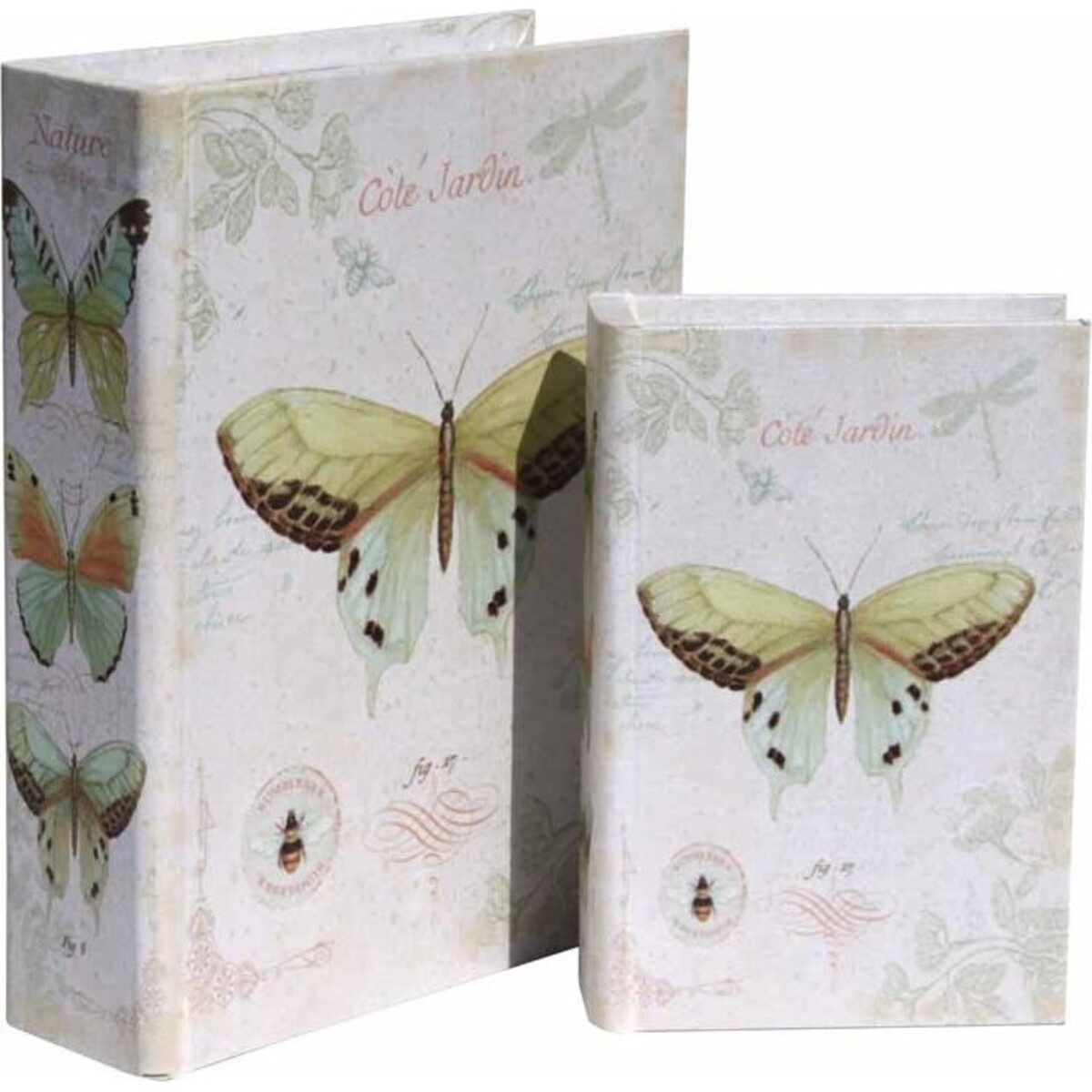 One smaller book shaped box stacks well atop the second larger box of the same shape. Scientific drawings are traditionally drawn with painstaking detail and accuracy. They make a cheerful accent to place among your cherished texts of science or literature. The design of butterflies on parchment evokes a bookish feeling that would do well on the surface of a coffee or tea table. Why limit yourself to the traditional coffee table books when you could add these cute Cote Jardin Book Boxes? They are perfect for the storage of all those odds and ends that tend to accumulate on a busy table; and, a good way to conceal those little secrets amid your books.