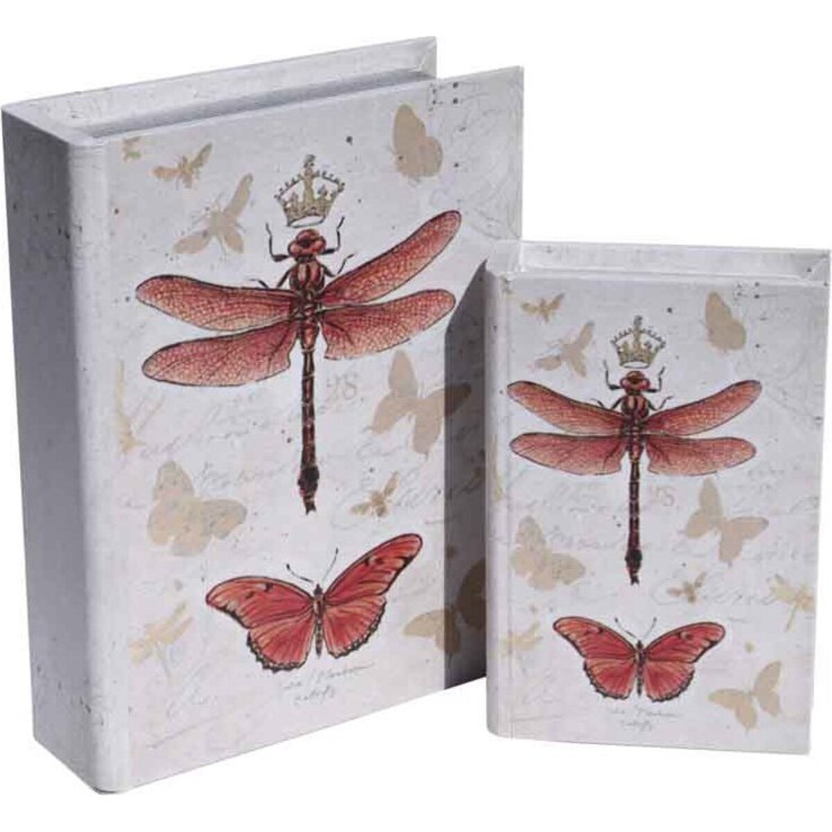 The dragonfly is the traditional symbol of the dream world and the illusion of material existence. It is also a suitable option for those who enjoy nature, but are tired of so many butterflies. These beloved insects are illustrated in the manner of a scientific drawing. The crown stamp that appears to sit so grandly atop the head of the dragonfly could make any gift recipient feel like royalty. This set of two book shaped boxes come in two sizes that include a small book and a larger one. Feel free to stack them atop of each other in your display, or to spread them apart in a way that encourages uniformity on your book shelves.
