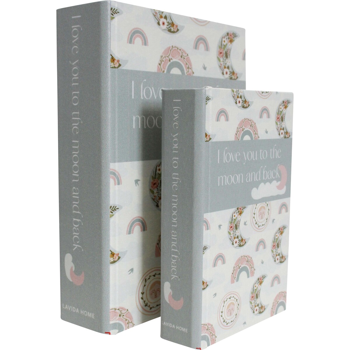 With a charming and magnificent design, the Moon & Back Book Box Set entices a subtle, captivating fragrance, as if the very essence of flowers permeates the air. Its moon-shaped patterns are adorned with meticulously arranged flowers, showcasing a dazzling array of blossoms in every imaginable hue. These stunning trinket boxes cleverly resemble books, effortlessly adding an element of elegance to any room. Moreover, their sturdy and durable design allows for the versatile storage of favourite items, offering a flexible approach. Crafted from high-quality materials such as MDF, canvas, and PVC, this set of two boxes exudes rustic charm. Beyond their aesthetic appeal, these ornamental boxes serve as multipurpose and eye-catching accessories for homes, workplaces, or libraries, seamlessly blending beauty with practicality.