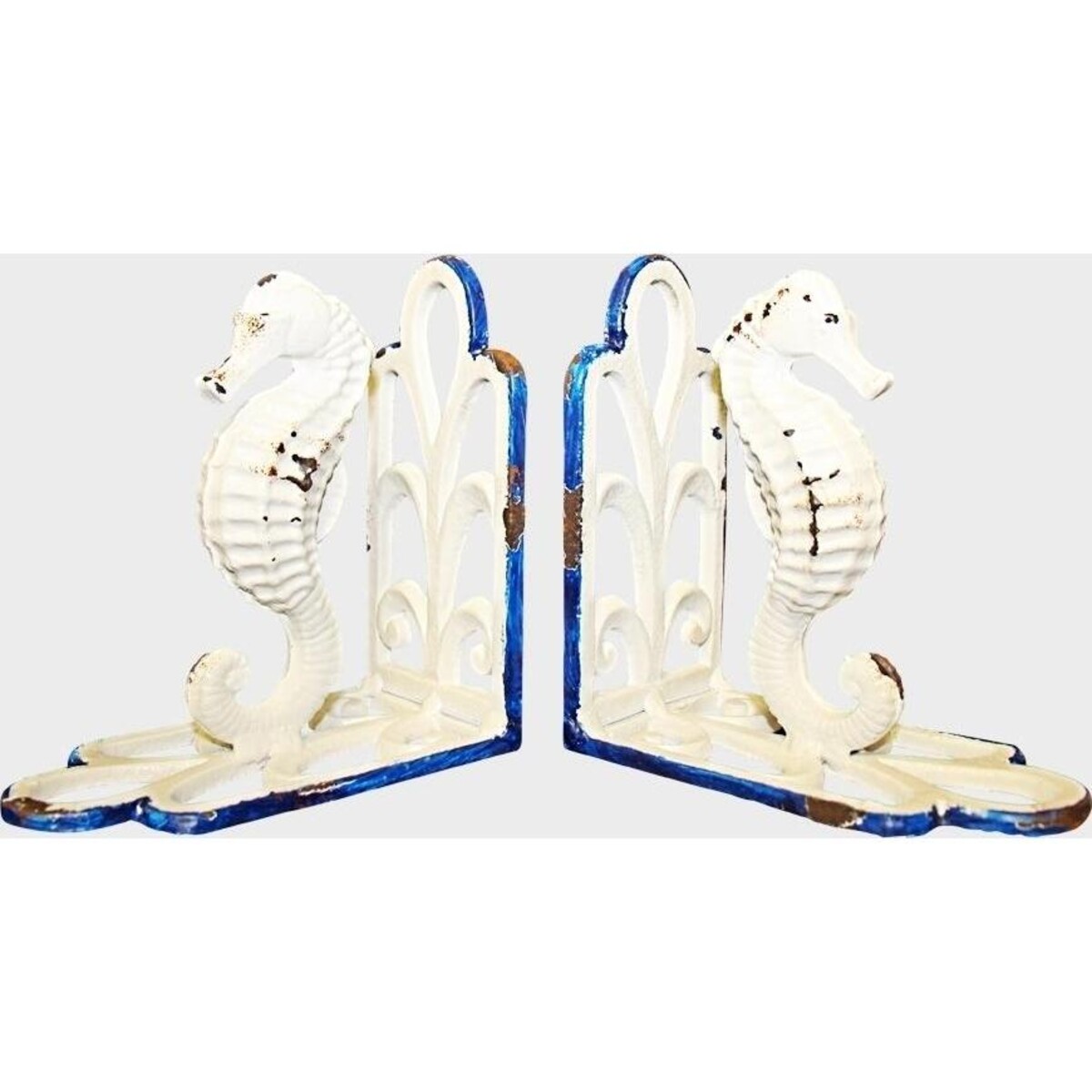 Add an elegant piece of marine themed book end set to your space and give your books the well-deserved support they need-well literally speaking they not just support your reading habit and the collection of books you own but are sturdy and well designed to take their weight upon themselves too. Made of metal the seahorses on with sides of the stack of books shall keep the books from toppling over in a messy heap and at the same time their definitive design, the marine themed beauty they bring to the space is another cherry on the pie. A gorgeous scroll pattern adorns the side of the bookend while the edges are in blue lending that all important pop of colour to its otherwise shabby white colour with profound rust and distressed feel all over. Build in the antique magic alongside the marine one and you have a winner in the form of this set. Will make quite an impact on your book shelf and around.