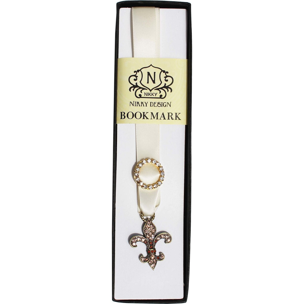 The charm that hangs at the end of the satin ribbon is the timeless figure of a fleur de lis, in which are embedded white, smoky white stones and dotted with red ones at the center.
