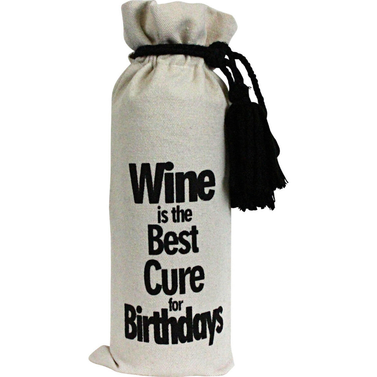 Any wine lover would agree that of there were a worry in the world - or any that has to do with one getting old - wine can fix it. Is there a problem in your mind that cannot be fixed by wine - impossible? Celebrate this freedom from worry that wine brings into your life with this tidy little message atop a gifting bag meant for wine bottles Who else could be carrying this sort of a bag but you - a lover of great wine for someone who loves it as much. The sturdy polyester and cotton fabric blend and the pull tie at the top allows it to close quite well and the tassel there adds to its lovely detailing. A simple off white and black classic cloth bag that would work wonders for making rand present from a bottle of wine. The kind that will be loved as much by the one receiving as by the one giving it away!