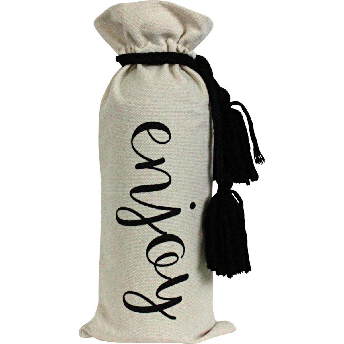 Made of a fabric which is blend of polyester and cotton adds to its durability and of course its reusability as well. Suited to most wine bottle sizes - the bag is all of 33 cm in height and has a diameter of 17 cm with a scrunched top that can simply be tied up with a tasselled tie up rope in black colour. The generous size of the tassel adds to its impressive look. The off white very organic feel fabric contrasts well with the black coloured tie up rope. The beautifully printed message adds to its look. Even the most ordinary of wines would look fabulous sitting inside this bag ready to eb delivered in great style. After all, even the simplest of gifts when presented well creates just the right kind of impression. The bold lettering of the message printed in its scrolled writing adds to its beauty. It's the kind of wine bottle bag that will be sure to be reused.