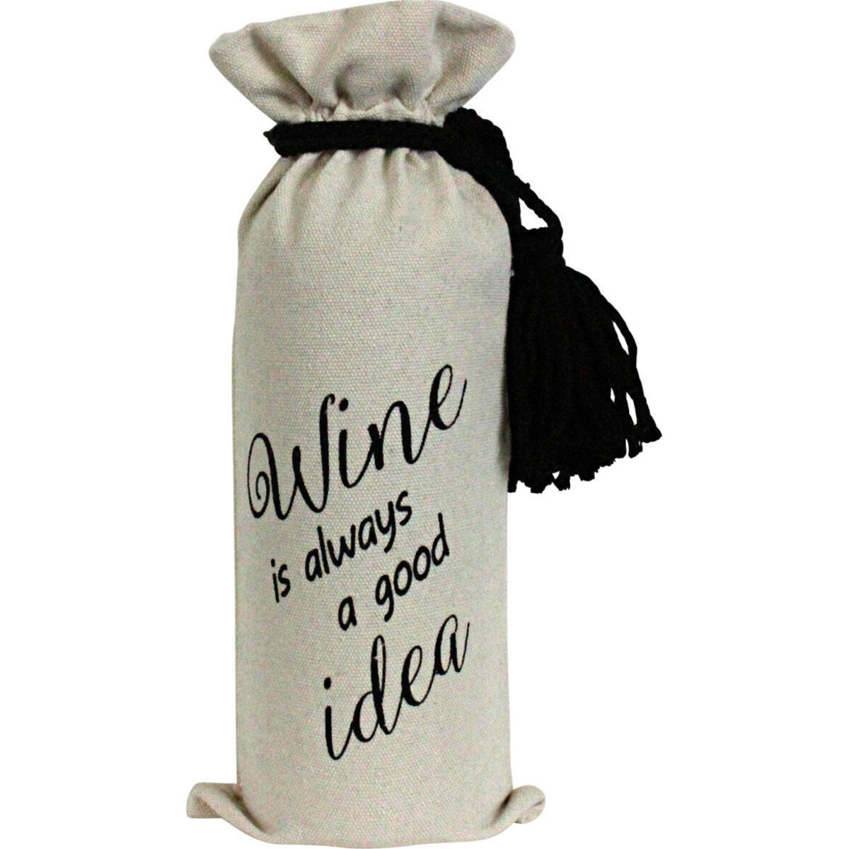 You have always struggled to find that all elusive bag in which you could carry a bottle of wine you wish to present. A superb gesture of thinking someone for their hospitality can be made to feel all the more wonderful when the bottle resides in a handcrafted smooth textured and tasselled in black, bottle bag. Designed to be snug and fitted the height of the bag is 33 cm in height and its diameter is 17 cm which make sit good enough for regular sized bottles. The tasselled upper portion can be pulled and it scrunches up adequately despite the thickness of the fabric lending the top a delightful look. The white fabric is organic in feel and the black rope tassels look great in contrast. The message atop the bag is printed boldly enough and will complement the look of the wine bottle to be gifted. The bottle bag is the kind that has been made from a fabric that combines polyester and cotton and thus is not just hardy and tough but also reusable.