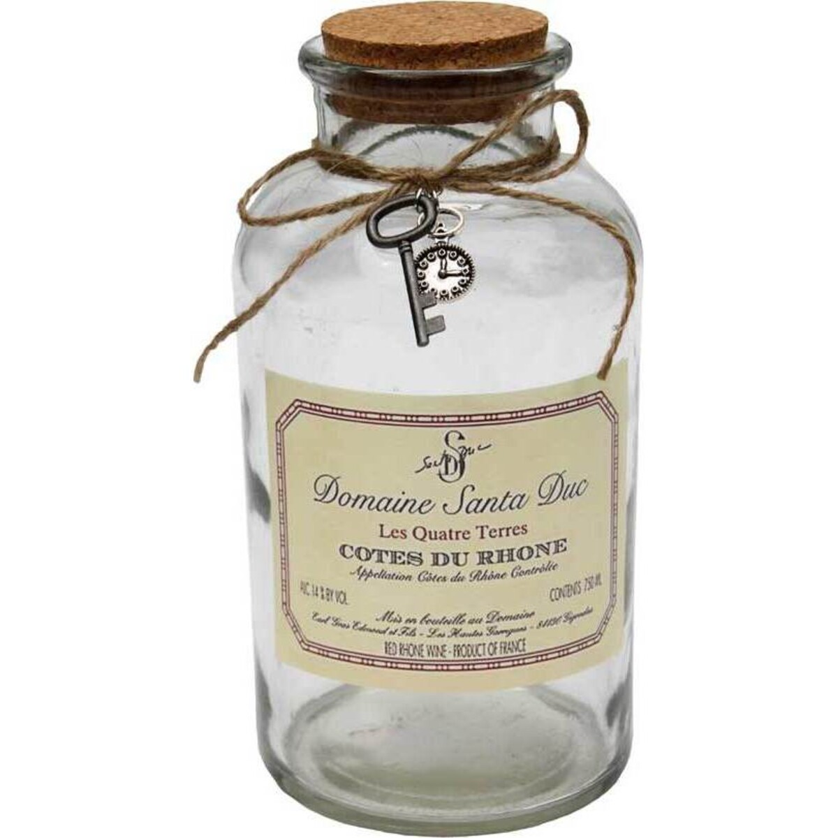 While it may not be the real deal vintage, this large Vintage Bottle with Key is a fabulous replica that is sure to have everyone fooled. The clear glass bottle features a cork closure, a twine bow around the neck and a vintage style label at the center that says "Domaine Santa Duo; Les Quatre Terres; Cotes Du Rhone." Attached to the twine is a tiny little key charm along with a little clock charm, both of which only add to the elegance and style of the piece. You'll certainly fall in love with this decorative accent.