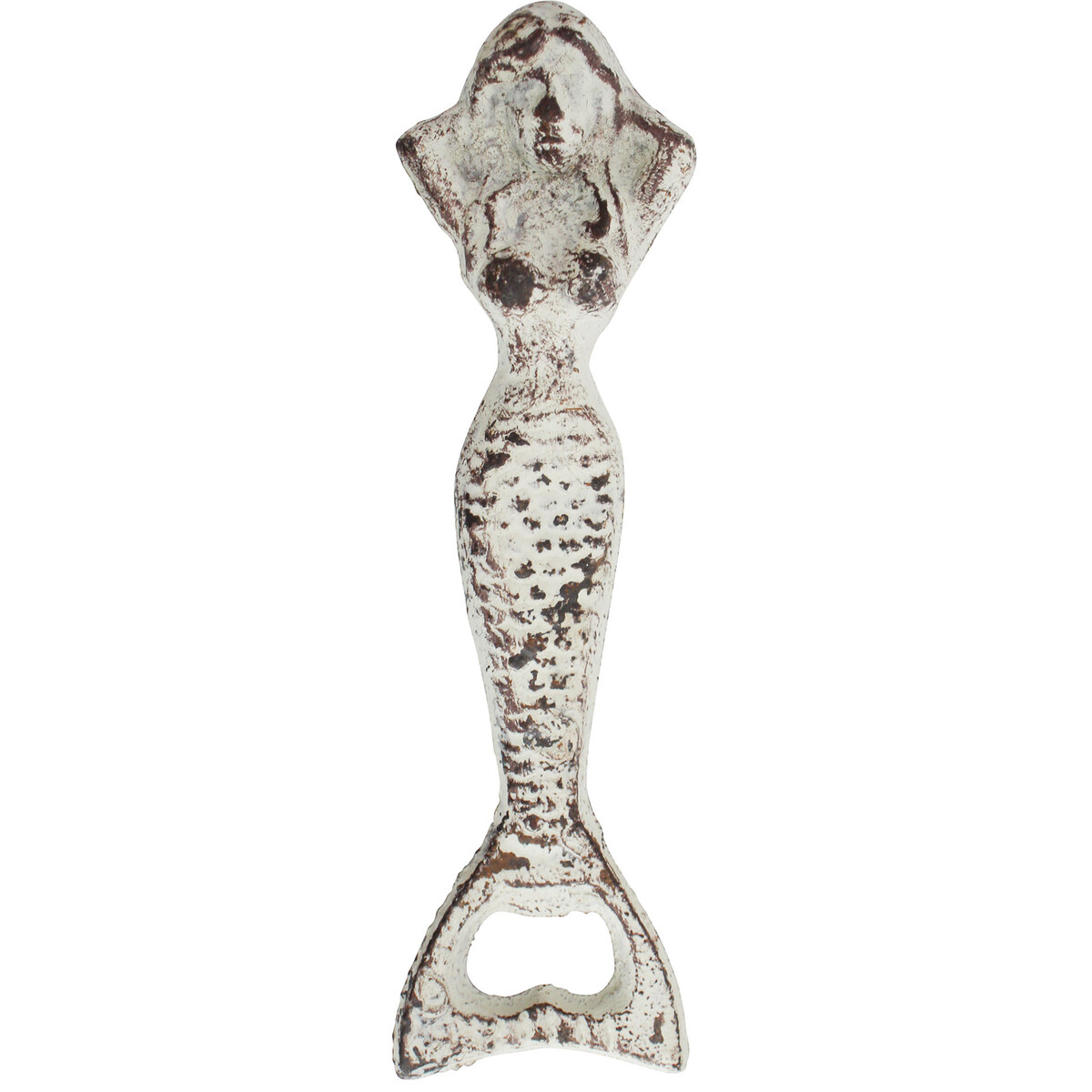 Bottle Opener Mermaid features a long and sturdy handle which makes swift removal of metal caps from glass bottles effortless. This lever is made from metal, a reliable material with tensile strength, and its sturdy iron hook. Possessing this metal craft for a task that seems as trivial as opening bottles reflects one's personal style and classiness. To enthral house guests, use Bottle Opener Mermaid to make them reminisce about the vast ocean. For those exploring unique gifts for lovers of the beach and the seashores, this nautical piece will make a statement. The overall appearance of this product is finely finished with a distressed paint job. The perks of it are its resistance to decay and corrosion. When not in use, you can show off this collection with other metal crafts. This opener does not require extensive maintenance.