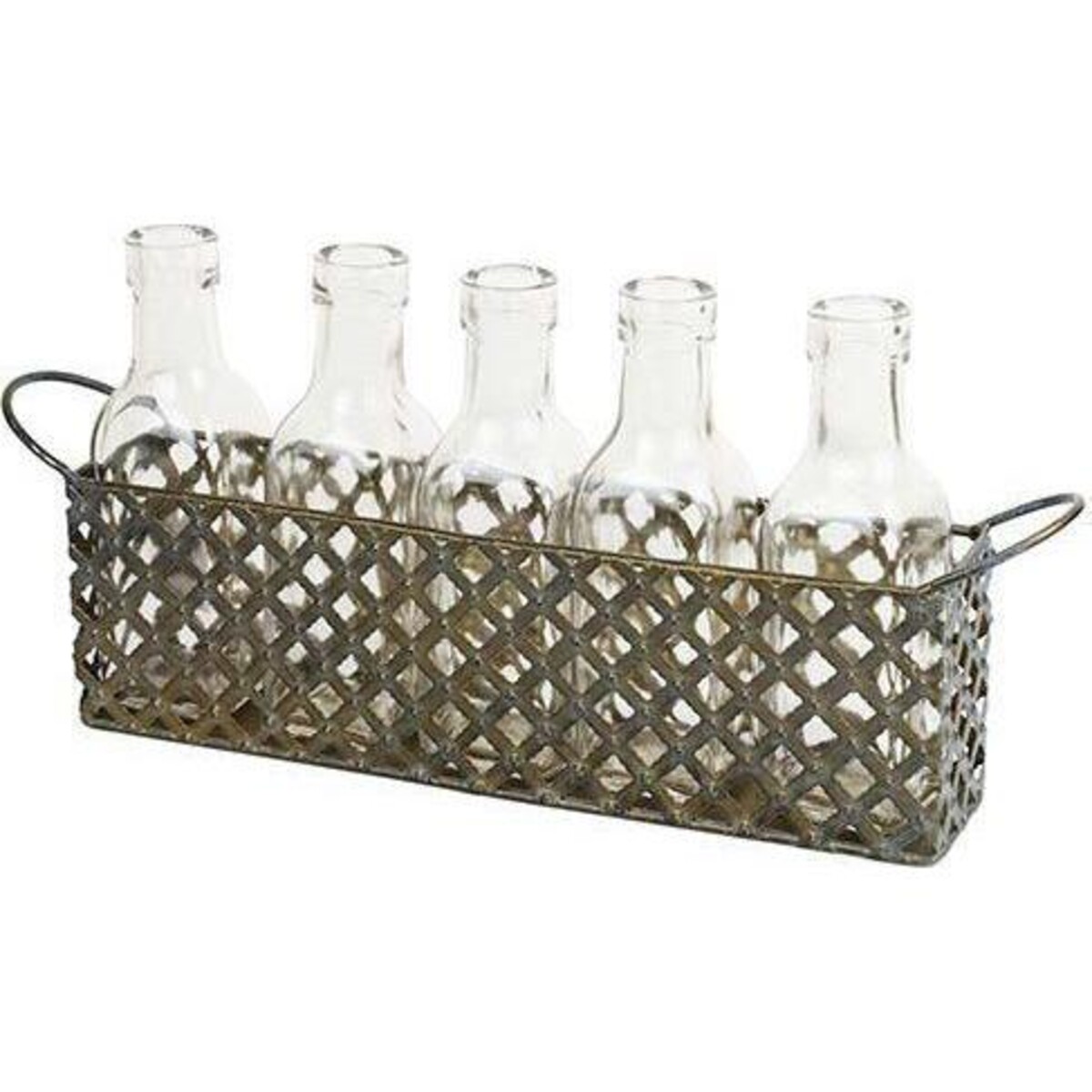 Lavida is always at the forefront of making all those additions in its offerings to its discerning buyers who are always making those changes in their interiors that sets their homes aside as unique. Here is a glass bottle carrier that makes an impression with the design on the case made up of strips of metal joined together with rivets. The detailing looks fabulously ornate despite its rather simple pattern. The rivets gleam quietly and the glass bottle shine in its interiors. Could be used for keeping wine bottles, water or simply for placing flowers and greens in the empty bottles. It is as much an organizer for bottles as it is a decorative puce and could be used dually. The height of the case is altogether 16 cm and the length is 36 cm. It has handles on the sides to allow easy portability. A solid structure with great styling makes it a one of a kind case for five bottles.