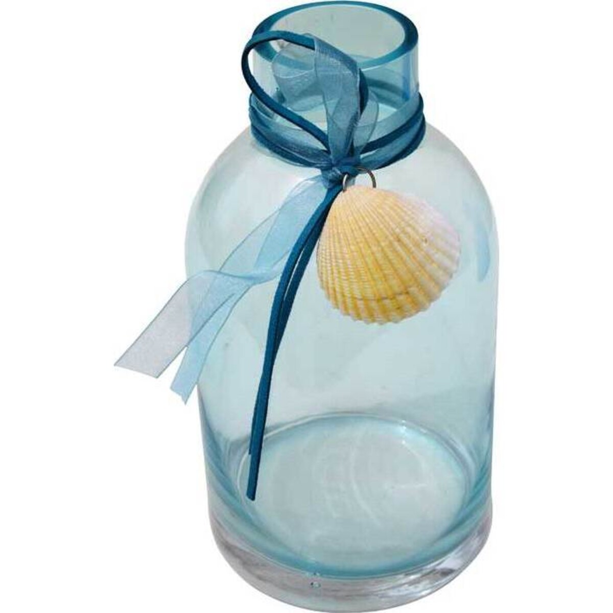 The item Bottle Shell Aqua comprises of a bottle of faint - blue shade, with a blue cord tied around its neck and holding a yellowish shell to the side. This gift item easily attains prominence when set at a strategic point within enclosed spaces or outside the home. It can be the central theme of a dining or other form of table. The artefact blends well with the outdoors and provides refined contrast with an array of settings that manifest scenic beauty. One may give it as souvenir to a friend or just acquire it for complimenting the landscape architecture of any piece of property.