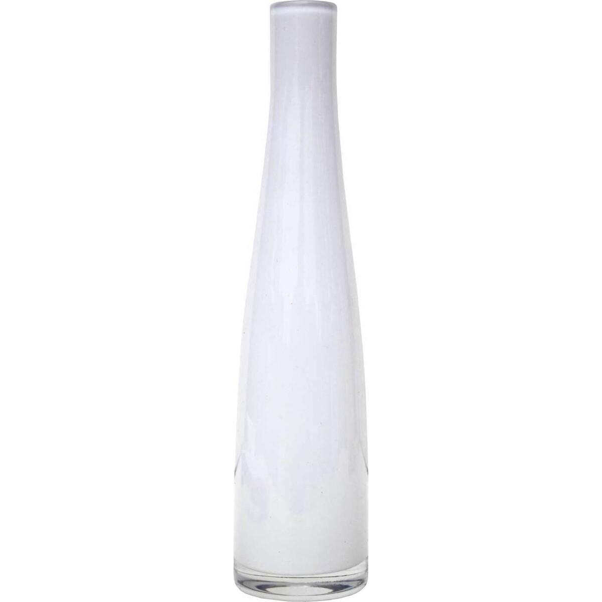 • The vase stands just over 9 inches in height and 2 inches in width, so it's the perfect size to add to a dining table, side table or shelf arrangement, perhaps with a single bud or flower. • White interior glass begins above the solid clear base, and the exterior layer gives it the illusion of fluidity and depth. Our White Bottle Vase will work well with any interior including contemporary, traditional, and eclectic. Use it as part of your lifestyle displays grouped as a centerpiece or individual place settings, and add it to your gift, home goods, and DIY departments.
