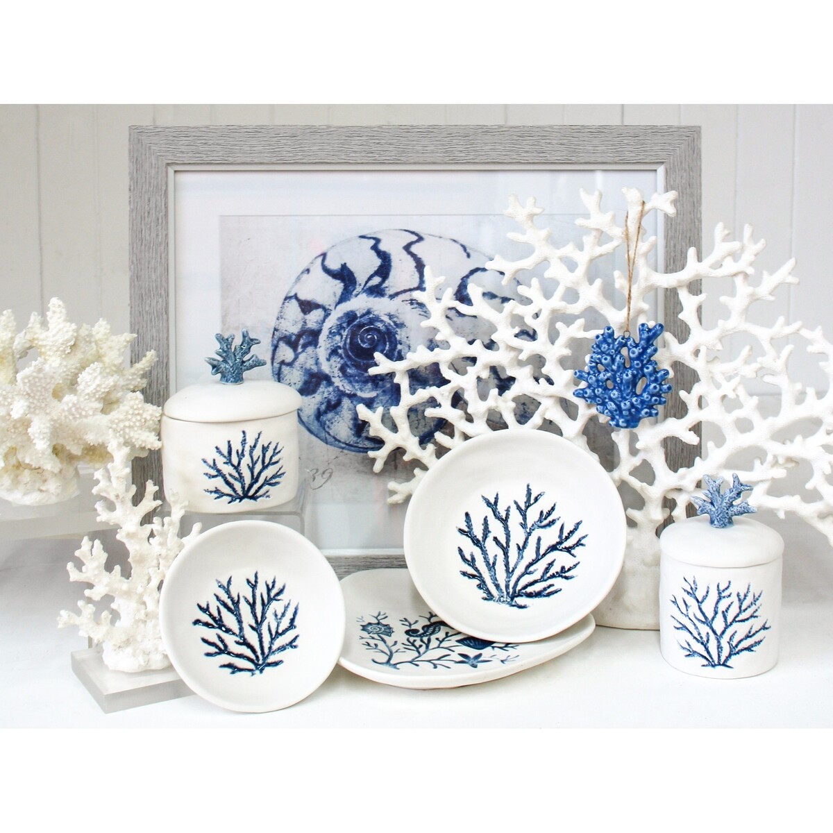 This large coral branching bowl not only holds food and anything else you prefer in plenty but also acts as an ornamental piece. Inside or at the centre of the bowl, lies a gorgeous coral that helps to complete/ cement the coastal appeal. The coral's branch like connections are engraved on the middle surface of the bowl and painted in blue. Using the blue hue creates an artistic touch and contrast with the rest of the surface, allowing it to pop. This unique bowl can adorn your living room, coffee table, display shelf with other coastal-themed items or kitchen. It can also be a perfect gift for a loved one who supports marine conservation or loves the ocean.