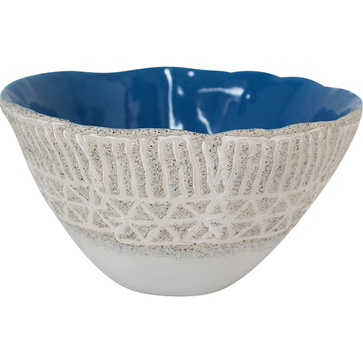 It is inspired by the ocean-the white of the outer much like a shell that ahs freshly popped out of the ocean- and the inner blue striking in its vibrance. This bowl is a great pick for serving or simply to use like any accent that could be used around your oceanic look home. Made from fine quality ceramic that ash been given a glaze like sheen on in the inner surface while the outer surface has been kept textured-gives it a rather unique kind of a look. A definite pick if you are looking to refresh your serve ware. The bowl sits on a round kind of base, well balanced and pert- while its diameter at 15 cm makes it large enough for usage for serving of finger foods and nuts. Create your own set and give your table top something of a refresh. The slightly wavering edge of the bowl makes it all the more delightful in its design.