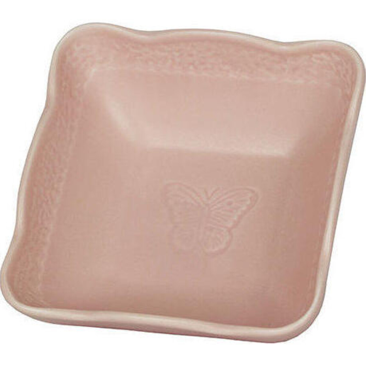 Making ceramic part of your décor or your serve ware is rather easy as it blends in wonderfully and makes itself add that touch of gracefulness to your table in an instant. This small little square bowl has 11 cm dimensions and an edge that has wavering shape lending it a delicate and rather beautiful finish, Smooth, crackled on the top to perfection through perfect firing and the gentle pink of the colour - all of these add the classical touch of something that has been created with much care. Tasteful table settings and serving to guests could always do with bowls such as this which could be used as much a serving platter for biscuits and cookies, or as a tray to hold your tea bags and savouries. The embossed butterfly at its base will not fail to get its fair share of attention. Serve fruits salads, gravy dishes or simply place it on the table with your over fresh cookies. It will look splendid making its marked presence as a highlight of your good taste.