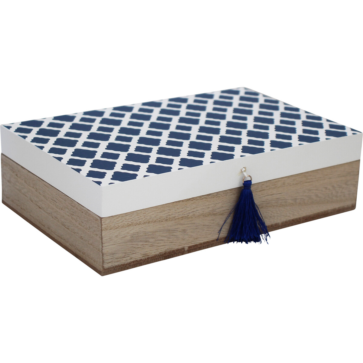 Jewelleries are often valuable part of one’s dress. This is why many people would go to great lengths just to protect and keep it safe from damage and harm. This is why this Box Blue Diamond Rect would be a quick selling jewellery box which your customers would be delighted to use in storing their special jewellery pieces. Apart from being practically functional, it is also immensely ornamental given the colourful blue and white square shaped pattern that decorates the top of the lid plus the blue dangling tassels.