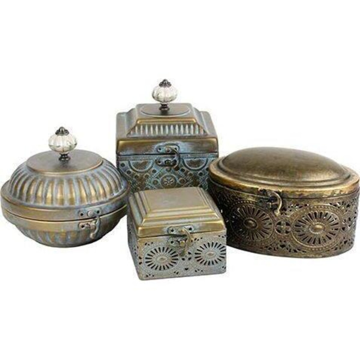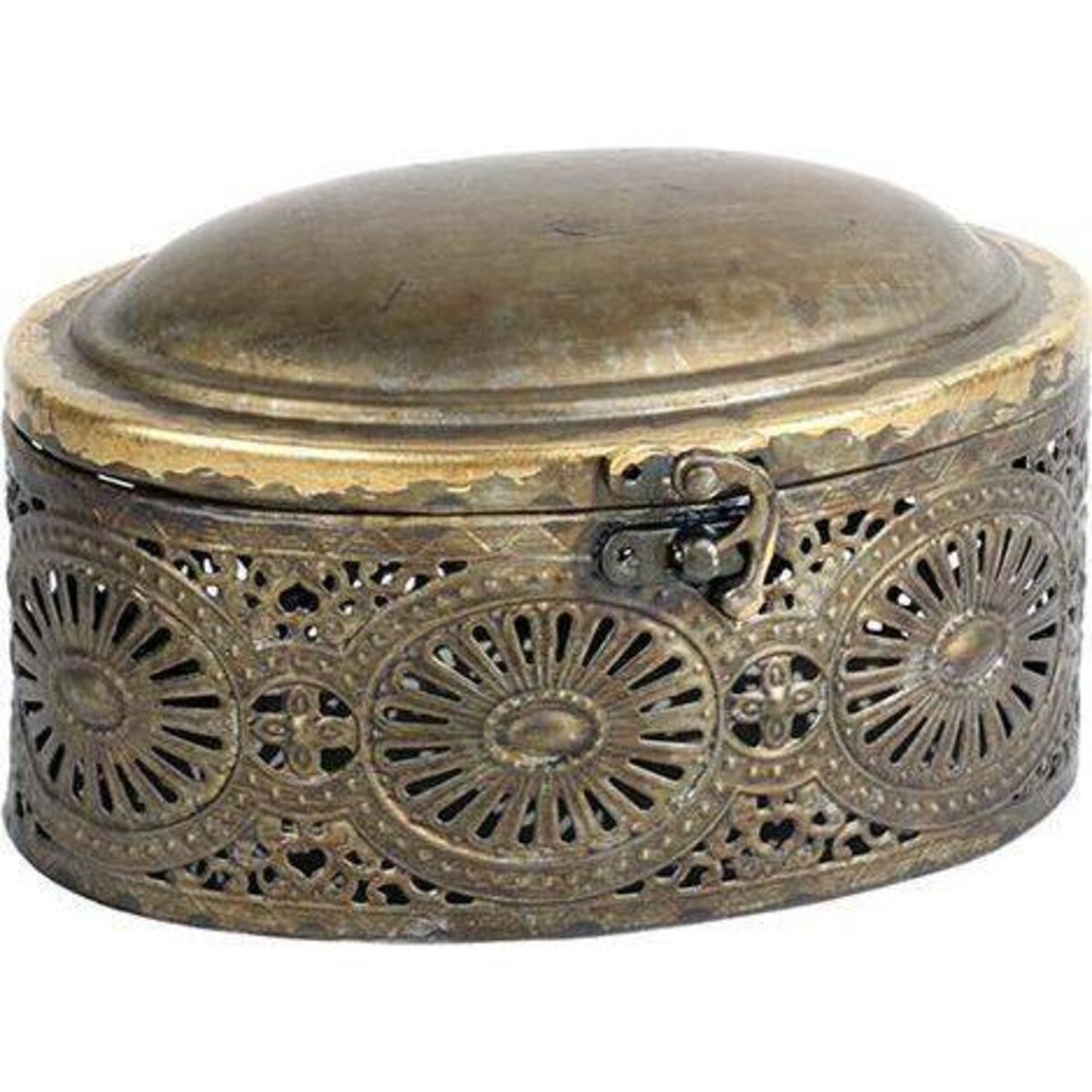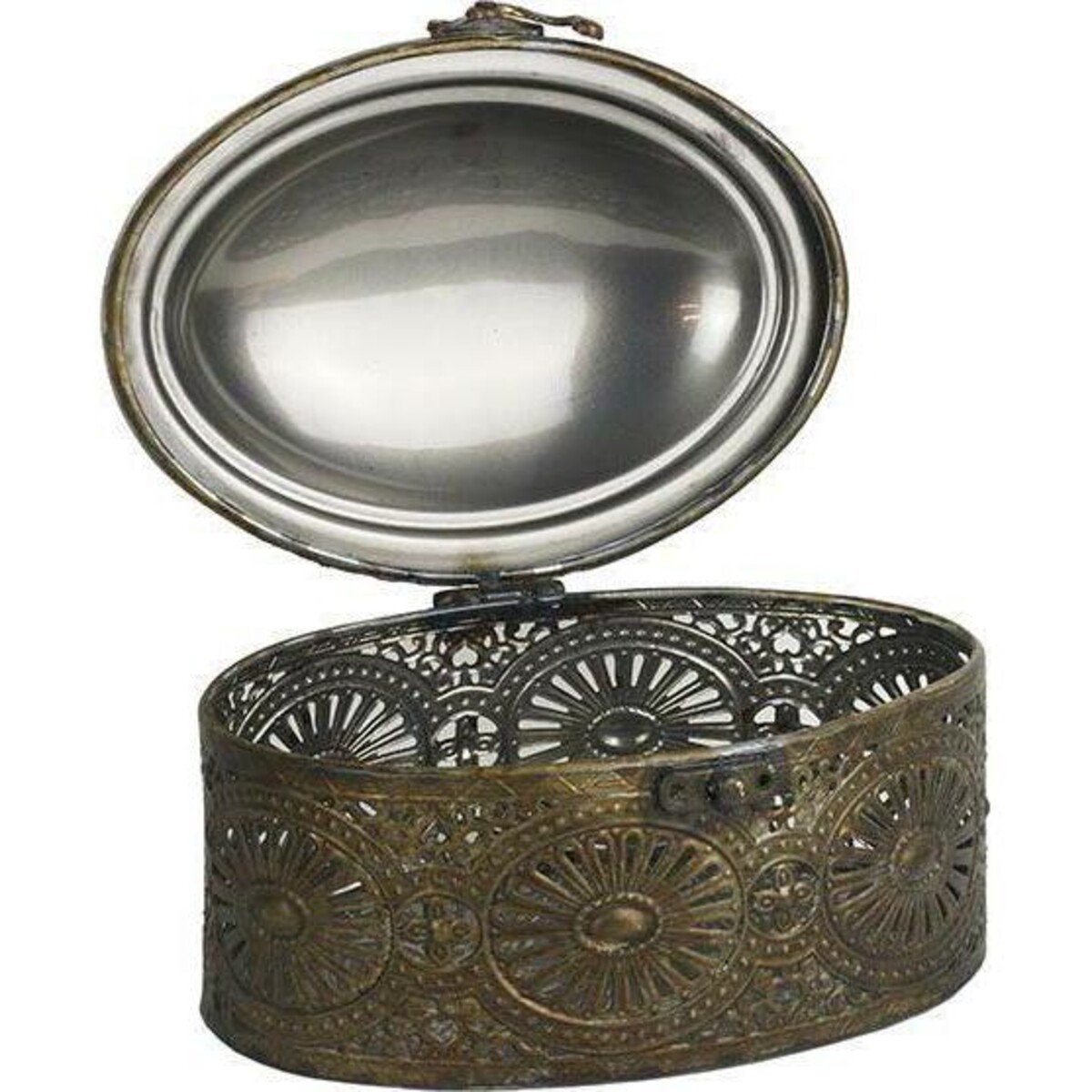 An antique accent on the table can lend a spot of classic luxury to your space with its elaborate design and its detailed hand worked pattern seen on the motif on top. This oval shaped box with its gorgeous styling has been made by expert hands that can craft such an elaborate design on metal. The oval box has a height of 11cm and a length of 18 and the width is 13 cm, making it large enough to hold as many of your keepsakes and collectibles as you desire. The closing mechanism too is a throwback of an old design closure. The box looks regal and very attractive when placed close to a lamp whose light would catch its quiet subdued glint. Place it on dressers or on the console table and add few more knick knacks to complete the look. The contrast of the smooth upper lid and the lower half filled with an intricate design is its most attractive feature.