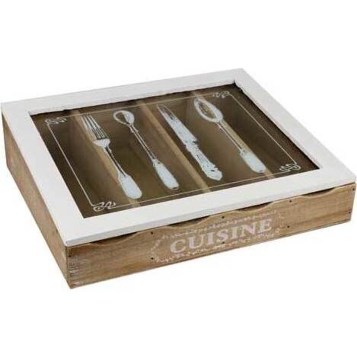 Made from MDF that will be water resistant, and glass that allows clear visibility inside the box, this four compartment cutlery box can bet clearly looking as handsome sitting on the kitchen counter as it can on the dining table. Smart and accessible in its design , the lid of the box carries the etching on it showing the sectioned spaces for spoons, knives, forks and dessert spoons. The light wooden colour gets highlighted because of the white border round the top. The closure of the box is easy with a lid that lofts and closes well. The slight grooves in each section allows one to place the cutlery and take them out without much fuss. The cleaning of the box too will be easy as MDF is easy to wipe clean the glass. The white printed word - Cuisine =printed in the frontage of the box also gives it an attractive design elements. The cutlery box ensures that when not in use the cutlery remains sparkling clean and ready to use. A smart and easy organizational box that can be very useful in all households.