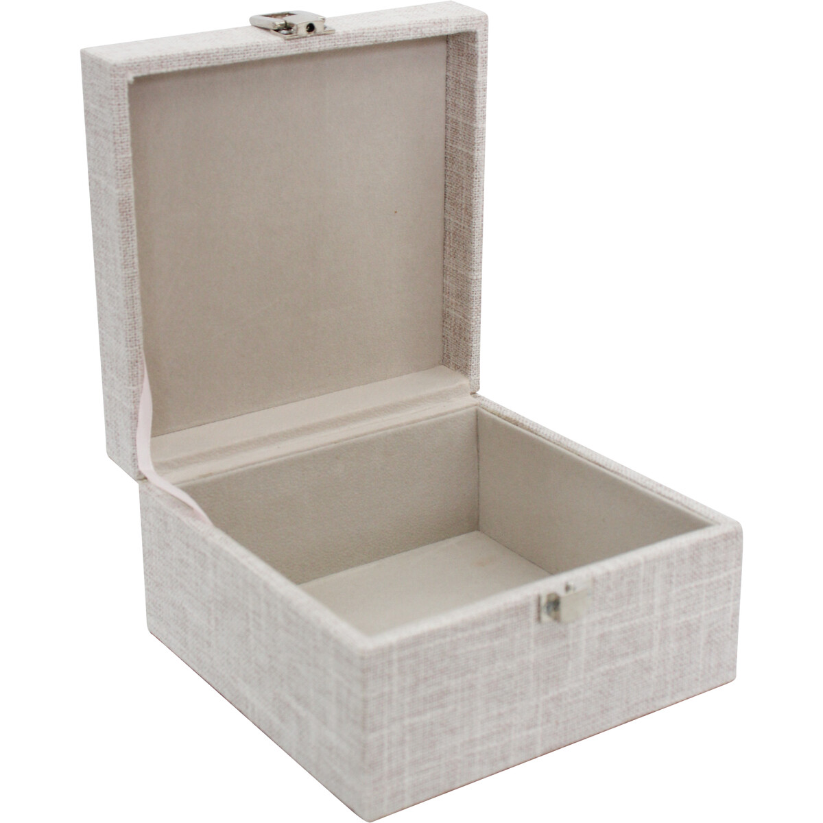 Give your collection of tiny trinkets the safest and most attractive of boxes to reside in till you need it next. Made from sturdy MDF, it has been given a printed linen cover that adds to its unique kind of look. The clasp which keeps the box firmly shut is made of metal. Hinged, the lid of the box is anchored with the help of a ribbon that keep the lid from falling backwards. The box is large enough for storing several of your little treasures and at the same trim compact enough to be used during travel. Adds an accent like dimension to the table top with its little presence. The line texture giving a unique twist to its look.