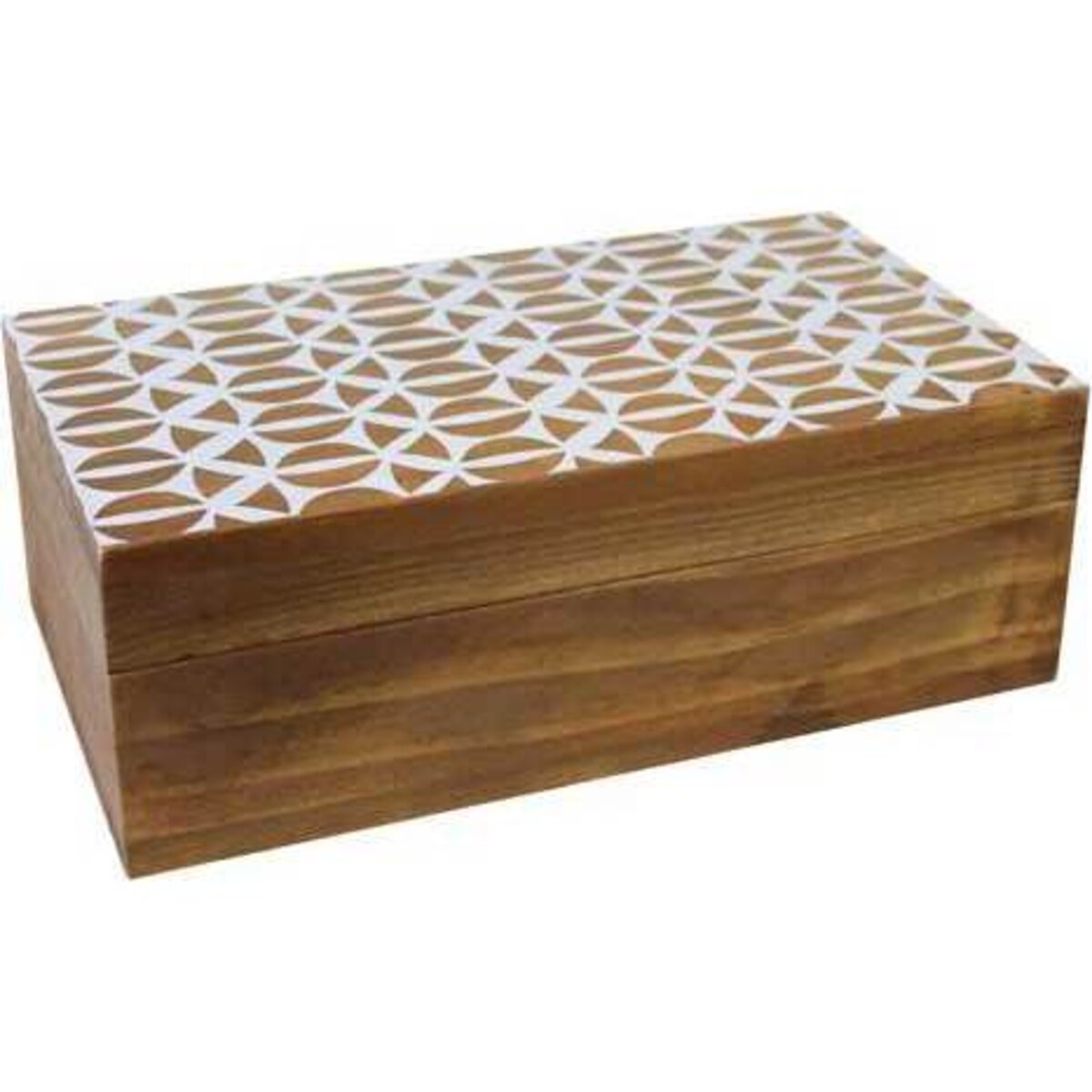 A wooden box such as this one with the dimensions of 23 cm length, 13 cm breadth and 8 cm height is adequately large to store numerous things - from trinkets, accessories to even keepsakes. There are always things in one's life that we value for their memory and their meaning and finding a pretty place to store them, assuring that the box they are encased in also looks great, is actually possible. This graphic print box with its white design on the top of the lid, the smooth finish of the wood and the neat and classic simple styling is what makes this a great storage space to opt for. The grains of the wood forms the most natural pattern while the edges of the lids have been smoothened out. The simple pattern of white on natural wood looks eclectic. This wooden box with its classic styling will most certainly find a place of p[ride atop nay dresser used for keeping tiny objects of utility like needles and thread or one's button collection or whatever one may fancy.