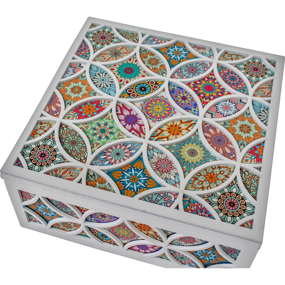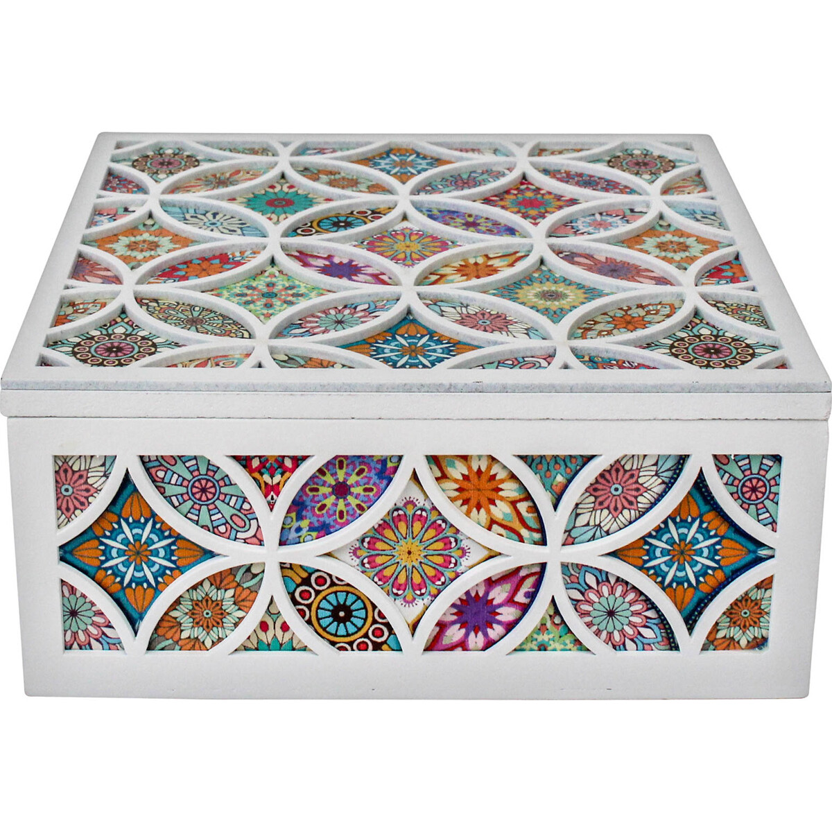 Add these colourful, decorative boxes to give your space a sophisticated and cool look. The intricate mandala patterns give you a classy and elegant touch and add great colour to your home. The cubical dimensions and plain white glass contrasted with the radiant illustrations provide a great look to your room. It is perfect for keeping your precious items and jewellery safe and protected so you don't loose them anymore. The box makes storage of small items which are easily lost convenient and is very safe for delicate items. This gorgeous box is completely environment friendly and no harmful materials were used in the making. The Gypsy boxes are highly durable and easy to carry and do not compromise the chic appearence making it a perfect gift for your friends and family. This exemplary box will enhance your home decor while keeping your keys and jewellery easy to find.