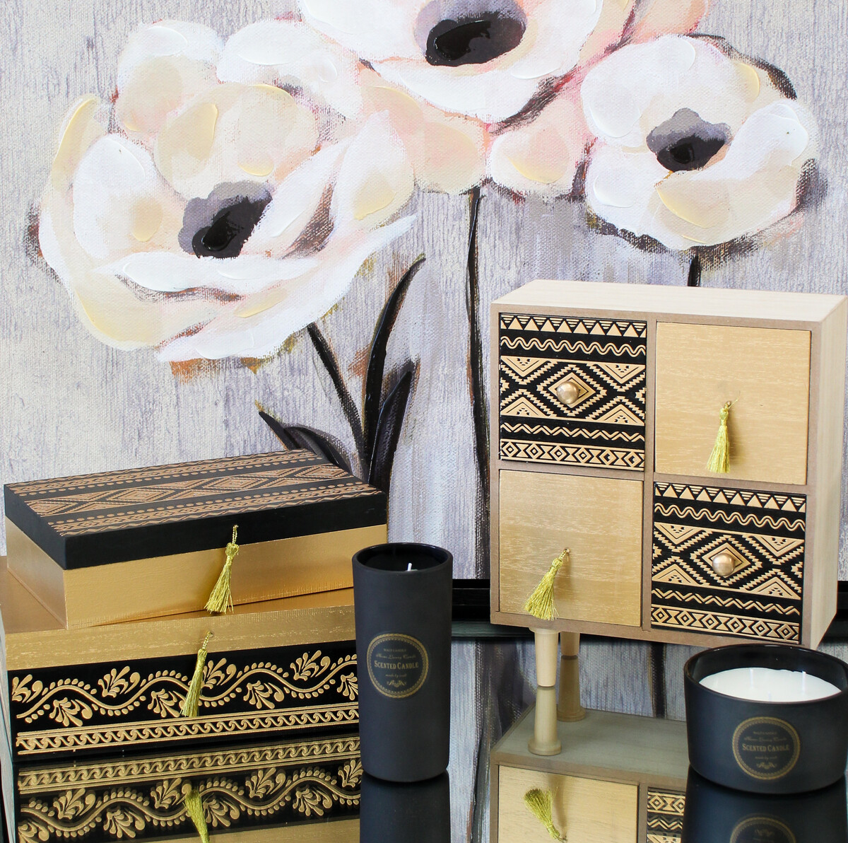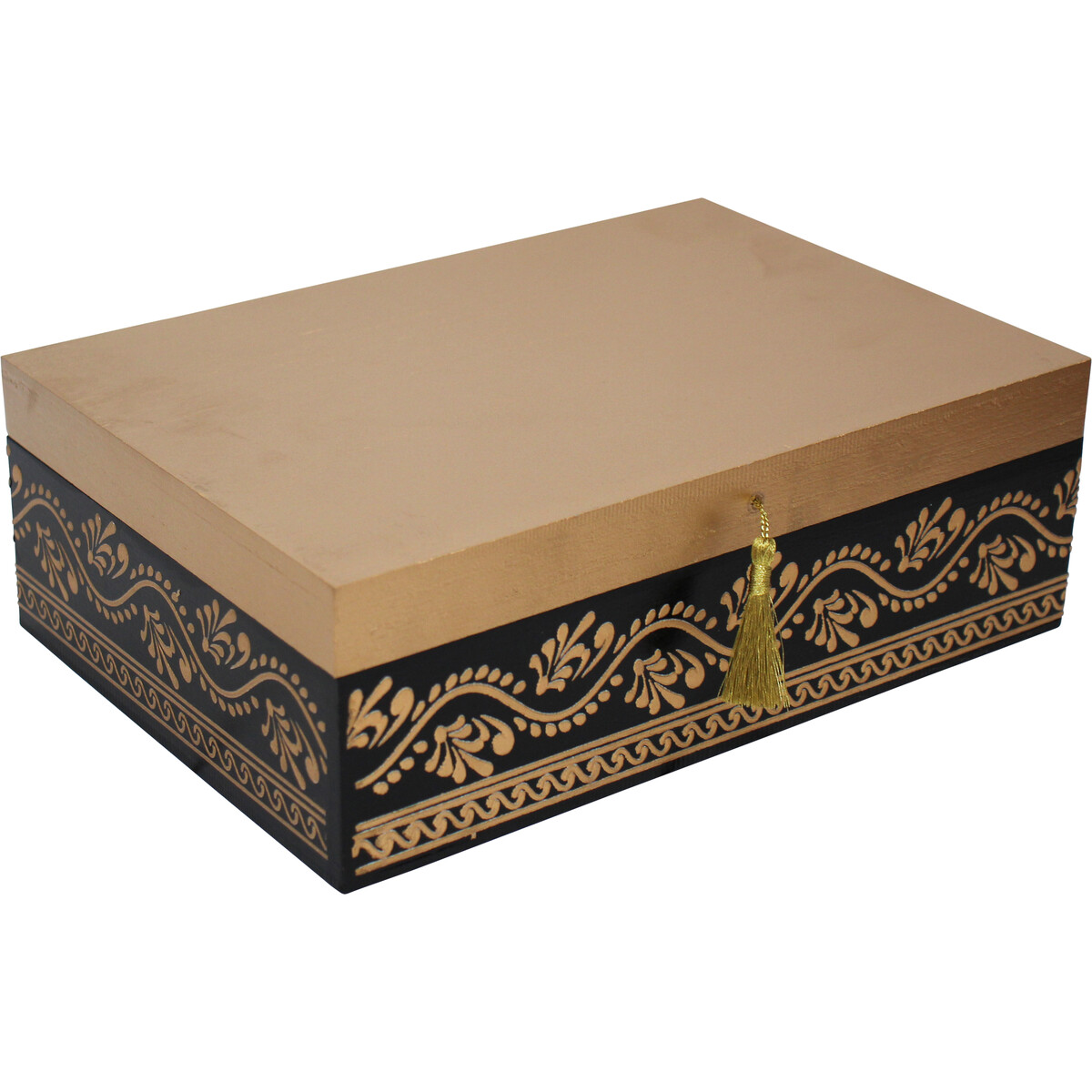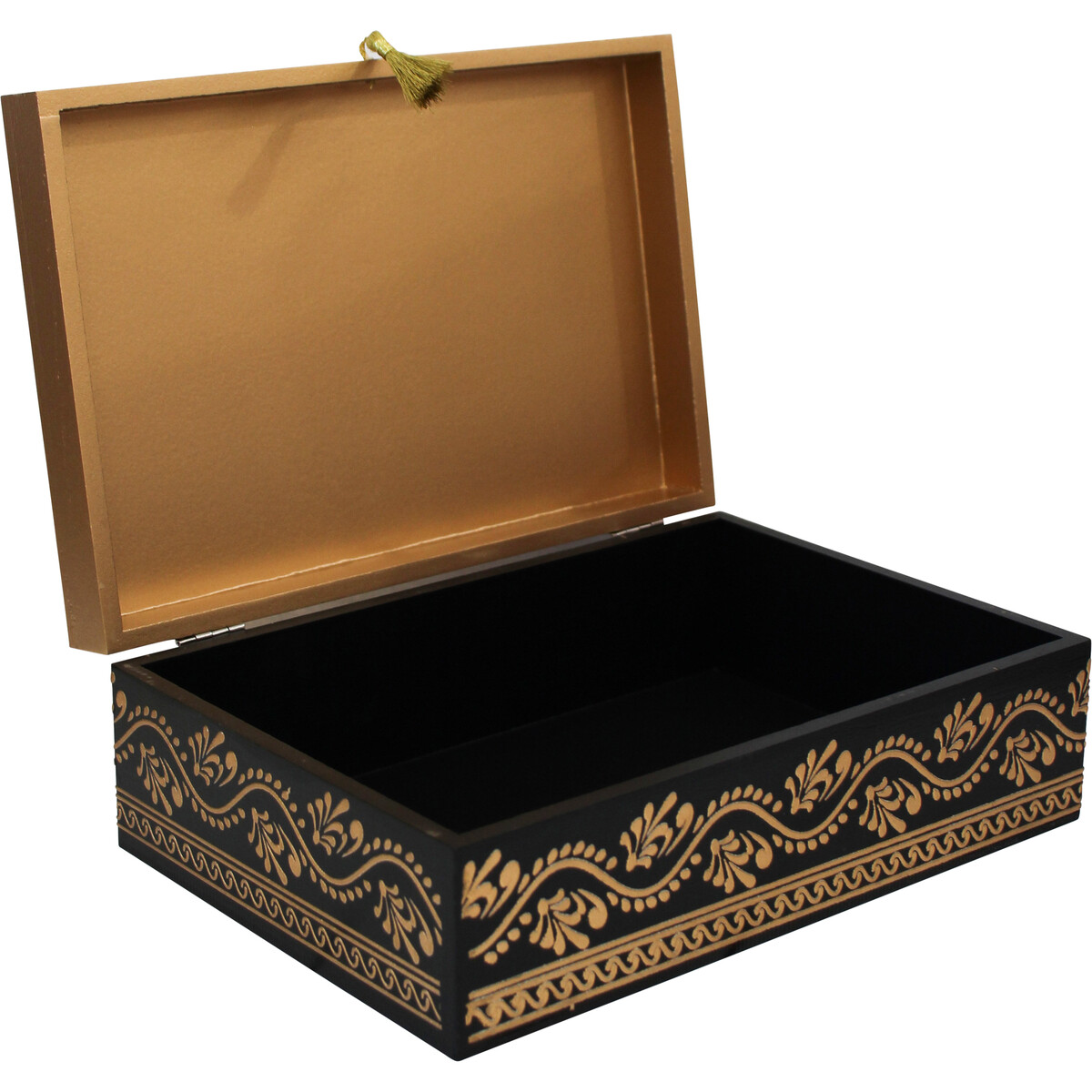 Showcasing a rectangular shaped box with such impressive ornamental inclination that makes it stand out from other boxes no matter where you may choose to display it in your shop, the Box Ishka Black A is certainly a decorative staple as well as highly functional as a storage box. It is made in a large sized design which measures 25 centimetres in length, 17.5 centimetres in width and 6 centimetres in height. Apart from its decorative functionality, it is also suitable for use in storing treasured items.