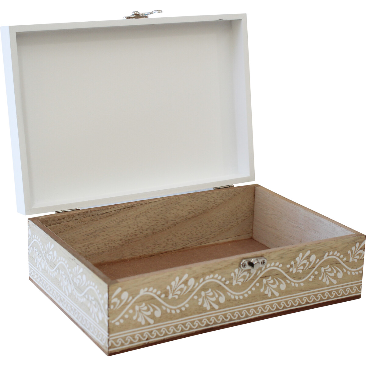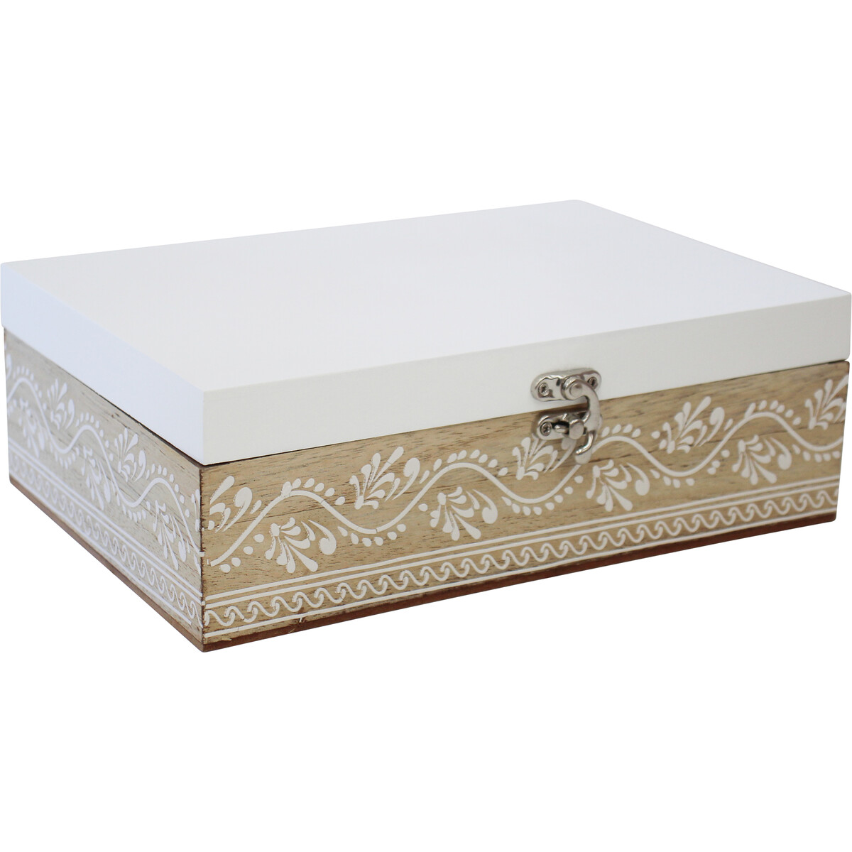 Charmingly hand crafted through the use of specially engineered medium density fibreboard materials, Box Ishka White Rect is a visually compelling wooden jewellery box every man would be proud to buy for a woman. And every woman would be delighted to have it in their possession. Even without its jewellery storage and display functionalities, it is suitable for use as a decorative ornament given the ornate designs which decorates the base and the ingenious combination of colours. It has a tight closing lid and can be secured using the metallic locking mechanism.